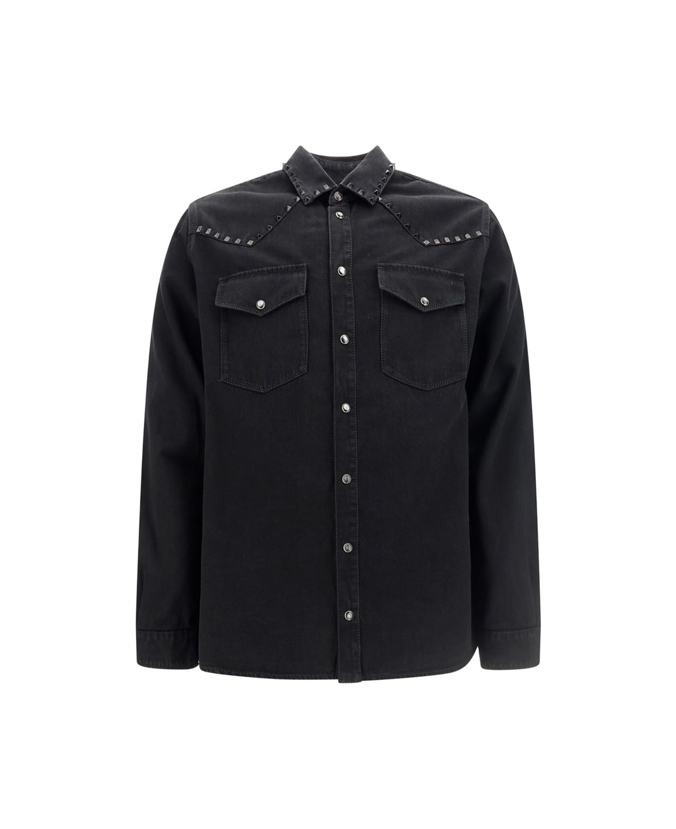 Cotton shirt by valentino pap, denim design, brand's iconic flat studs applied to front, classic collar, front button closure, two front patch pockets with flap for closure, adjustable button cuffs, regular fit. Composition: 100% % Cotton