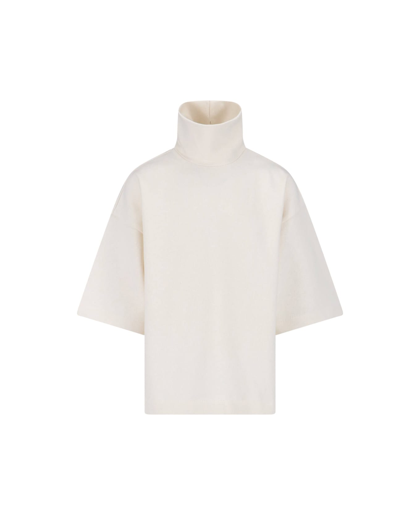 Fear of God turtleneck shirt, in cream cotton and wool, dropped shoulders, three-quarter length sleeves, centre back vent, back logo label, ribbed trim, straight hem.