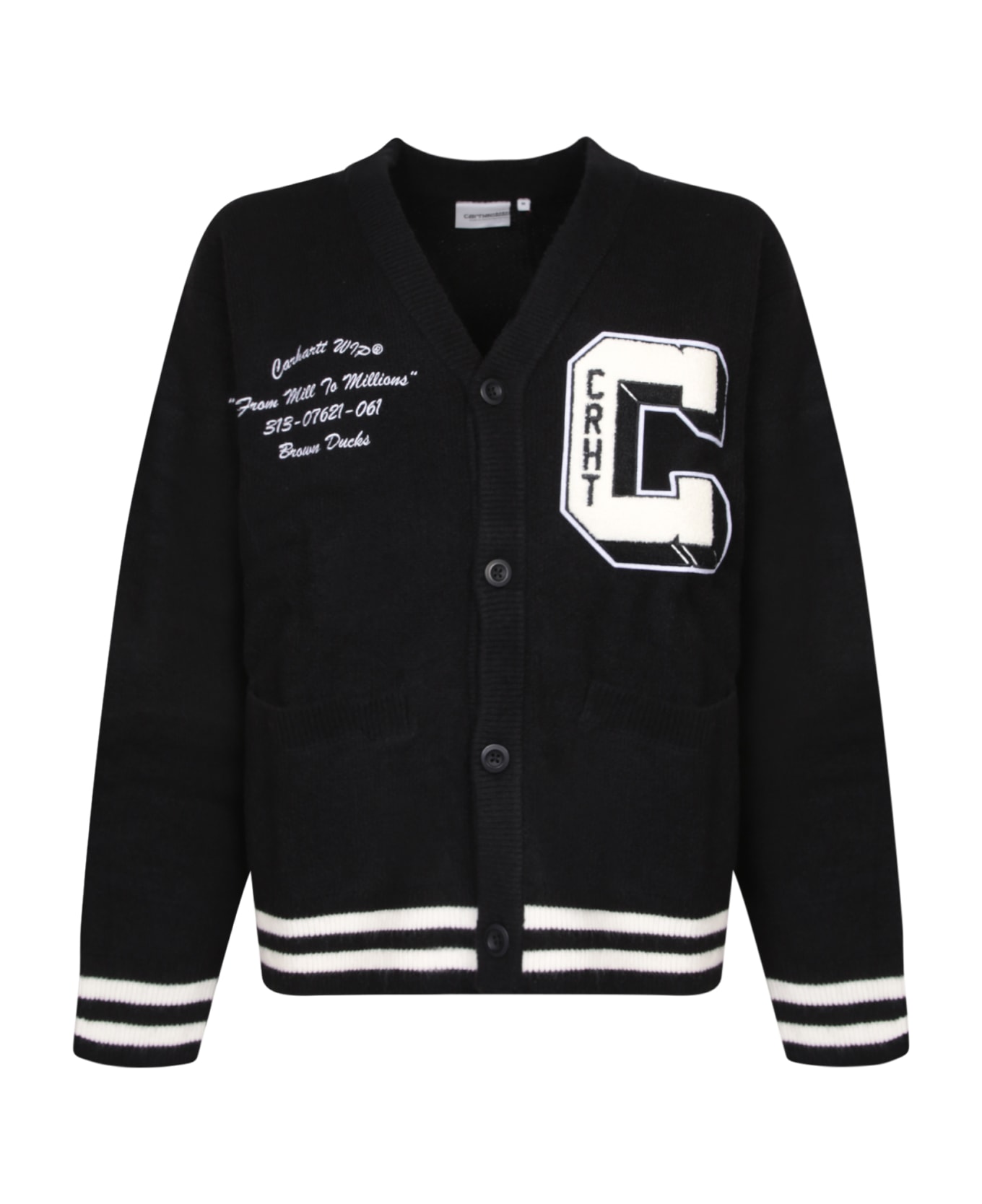 This exclusive black cardigan features a bold design with script and a large contrasting logo on the chest, perfect for a sophisticated streetwear look. Composition: 80% Acrylic, 20% Nylon