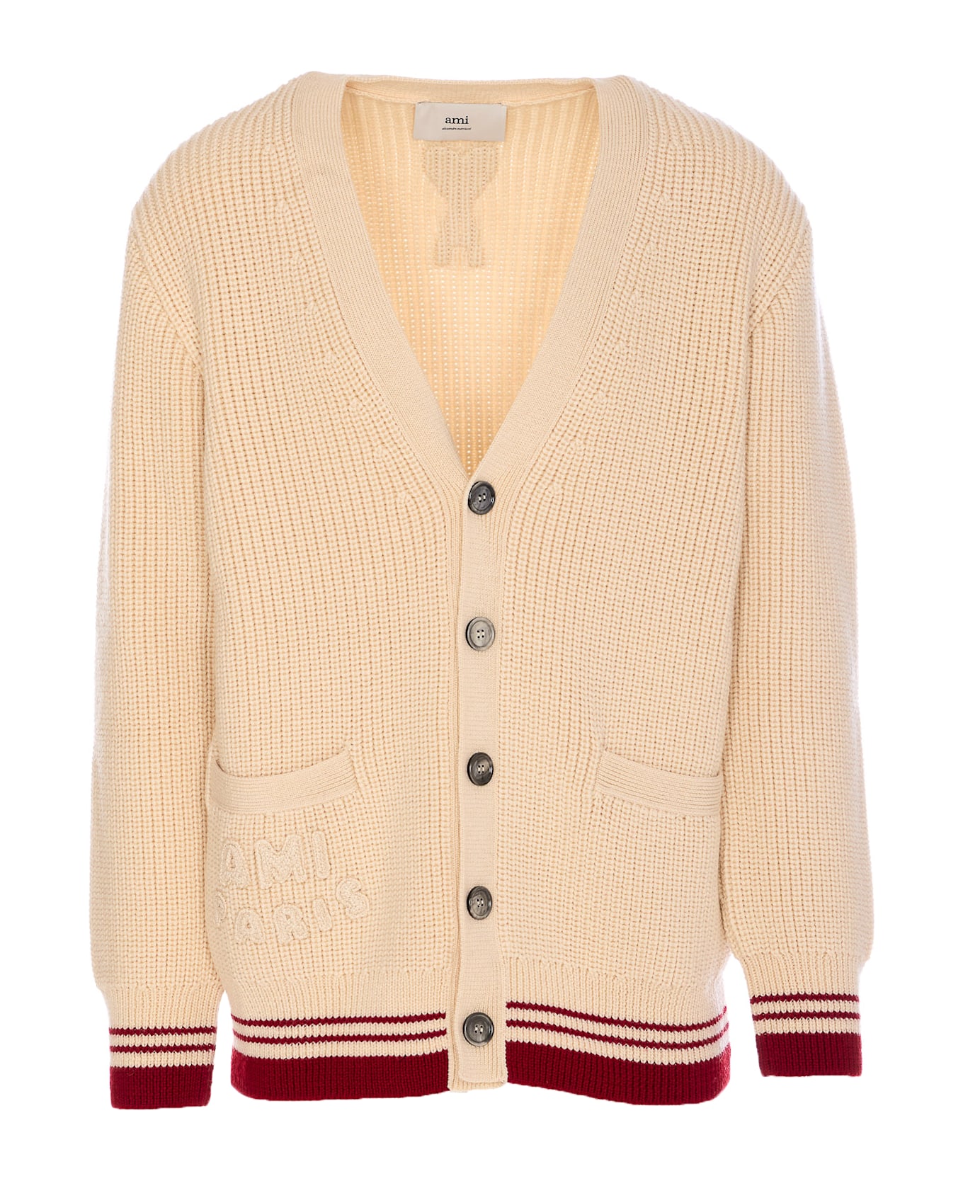 Ami - Alexander Mattiussi beige ribbed cardigan with frontal buttons closure, V-neck, long sleeves, pockets on the front, embroidered tone on tone logo on the back, embroidered Ami Paris logo tone on tone on the front Composition: 100% Virgin Wool