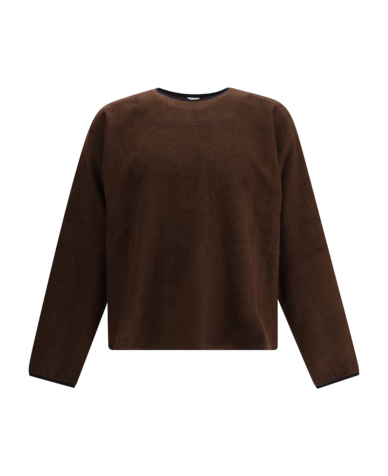 This dark brown wool long sleeve by gr10k combines warmth and softness with a simple, timeless design. its versatile plain style layers effortlessly for both casual and formal outfits, providing comfort during colder months while showcasing refined elegance