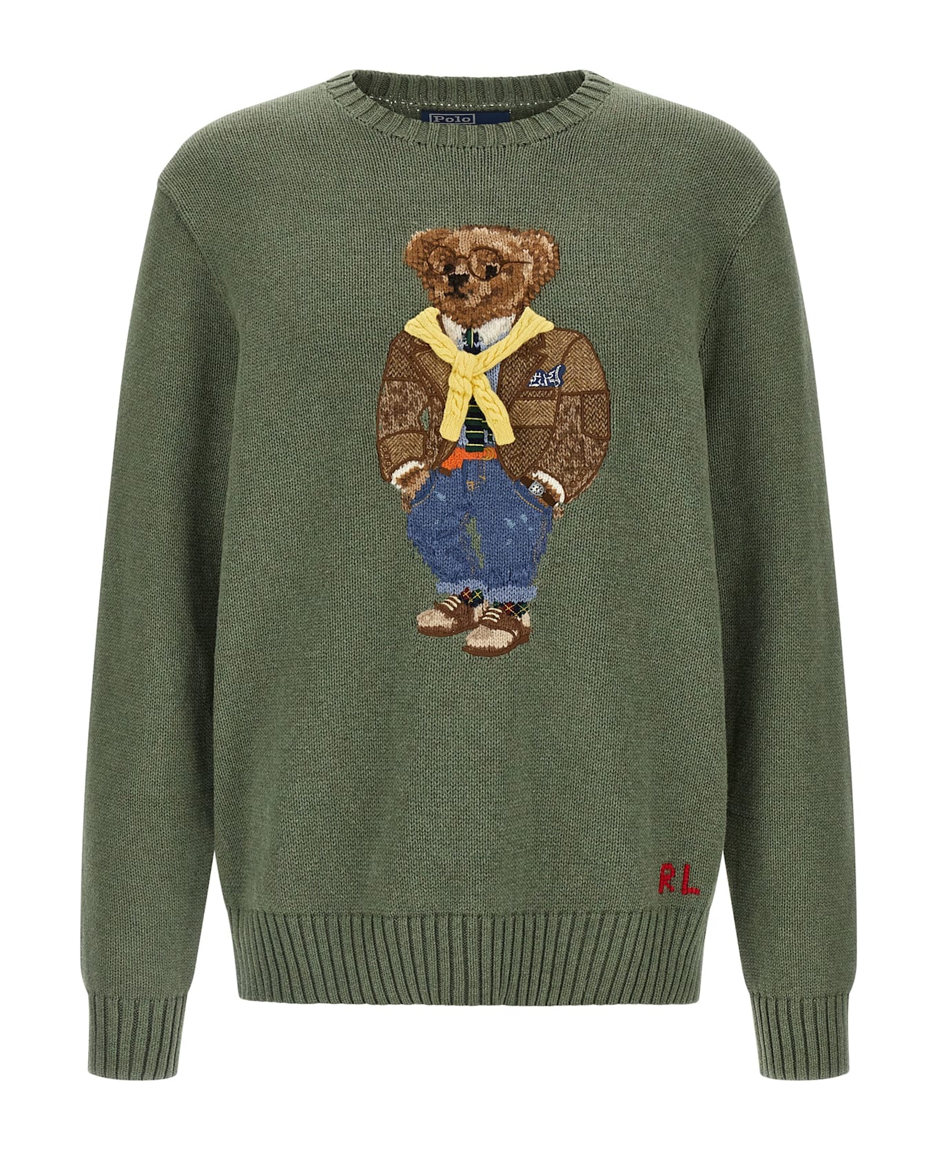 Cotton sweater, front knit 'Polo Bear' with inlays and details embroidered in wool twill, crew neck, long cuffed sleeves.