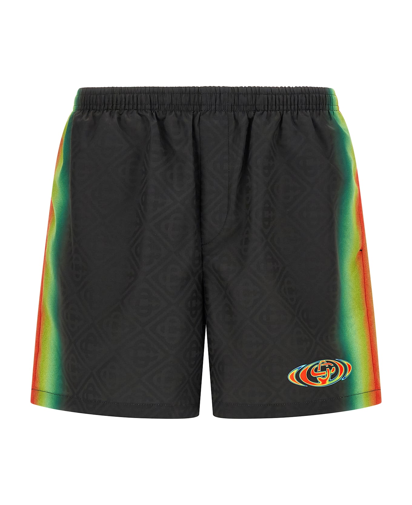 Swimsuit in technical fabric with diamond-shaped logo of the all-over jacquard maison, front logo print, elastic and drawstring at the waist, trompe l'oeil flap, pockets, inner mesh briefs. Composition: 100% polyester