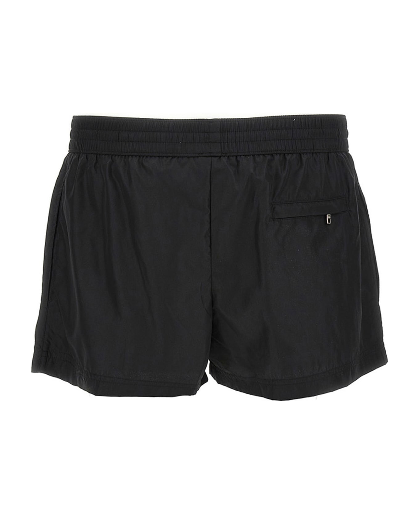 Boxer style swimming trunks with metal logo plaque, elastic waistband and a drawstring at the waist.