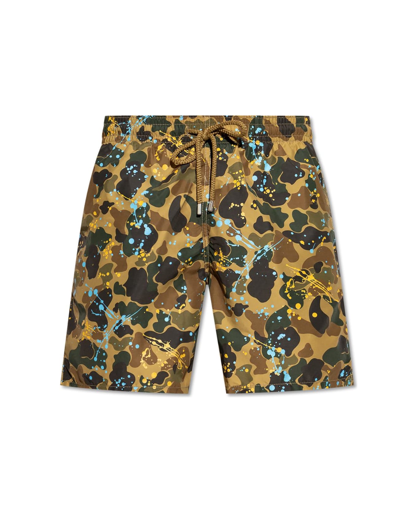 Discover the understated sophistication of the Palm Angels X VILEBREQUIN swim shorts, a hallmark of elevated resort wear. Crafted from a premium technical fabric that is lightweight, quick-drying, and moisture-resistant with a refined matte finish, these shorts promise both comfort and durability. The striking multicolor camouflage pattern, boldly accented by irregular blue and yellow paint splatters, radiates an artful, urban flair, capturing the essence of contemporary streetwear. Effortlessly designed with a classic, slightly relaxed silhouette hitting mid-thigh, these shorts feature an elastic waistband with a khaki drawstring, side pockets for convenience, and a back flap pocket secured with Velcro. Bearing the unmistakable influence of Palm Angels' heritage melding Italian tailoring with Los Angeles skate culture this exclusive piece stands as an extraordinary addition to any discerning wardrobe. Why choose this product? Luxurious, quick-drying technical fabric Exclusive, artistically inspired design Distinctive collaboration: Palm Angels X VILEBREQUIN Thoughtful details, including convenient pockets and an adjustable waistband Perfect fusion of Italian craftsmanship and modern streetwear elegance
