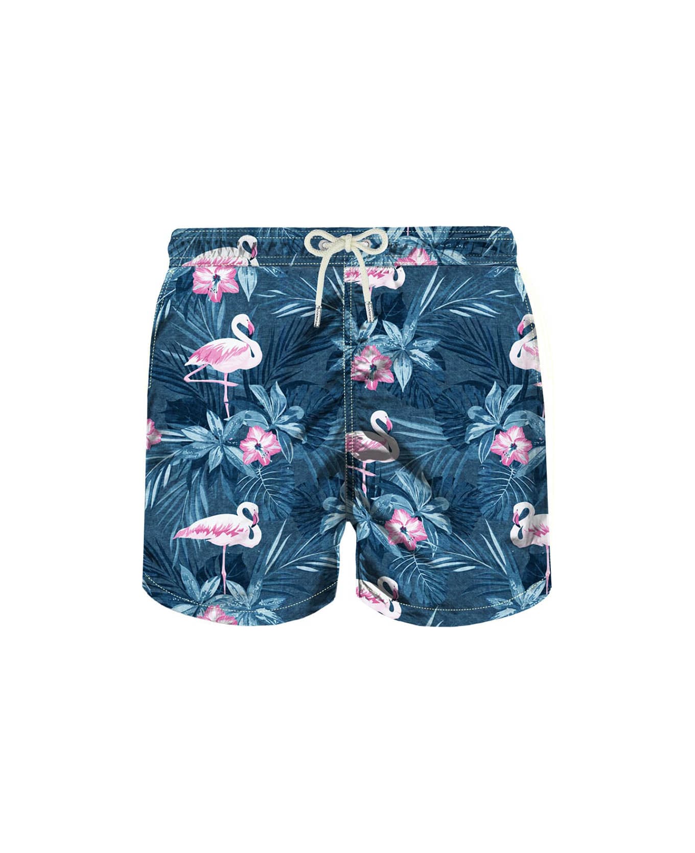 Indigo with pink flamingo all over print, Swim Short mid-lenght, regular fit, indigo palm microfiber, comfortable drawstring waist, inside ergonomic brief, pockets on both sides, backside classic pocket with velcro closure. Model Gustavia INFL61.
