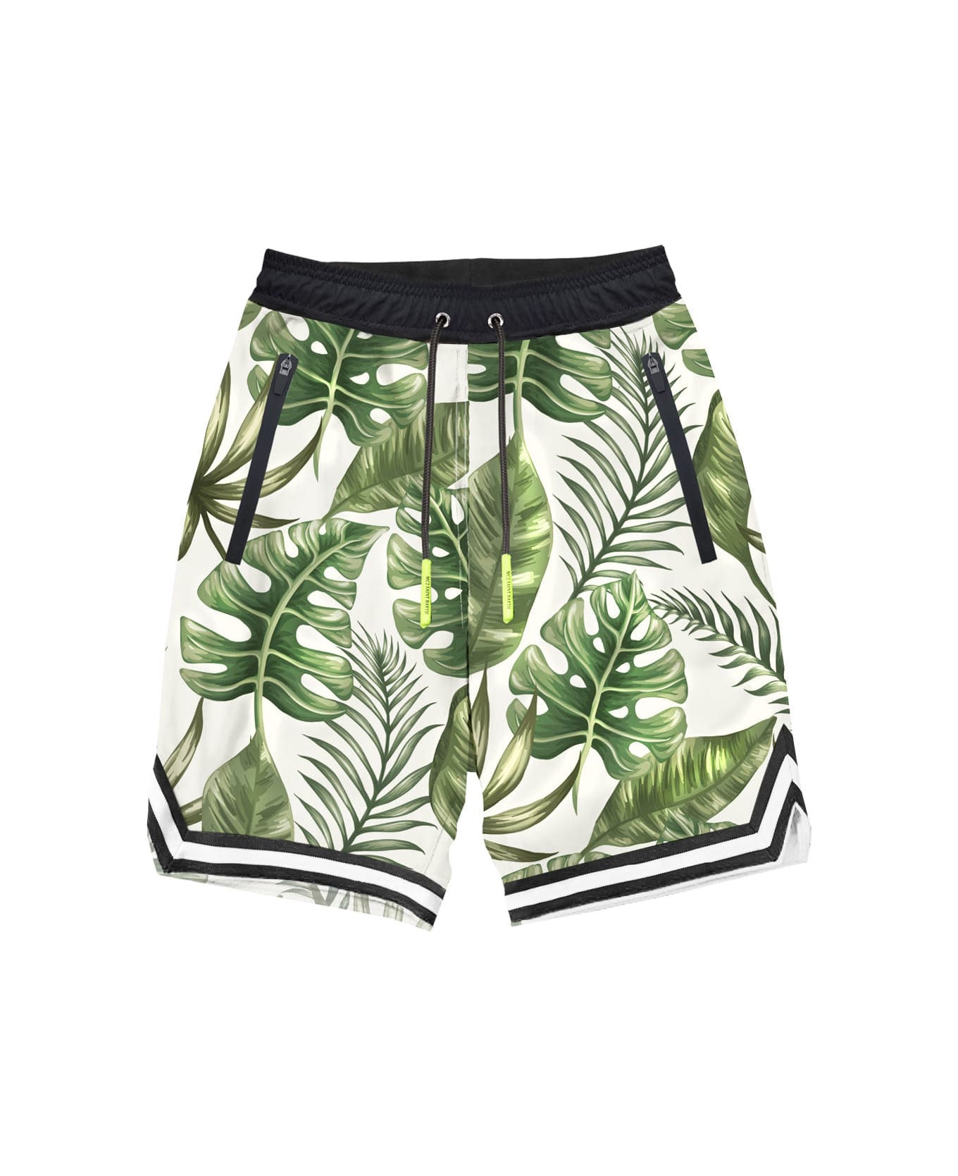 Discover the new MC2 Saint Barth Los Angeles capsule collection! Follow the spring summer trends for the beach and for your vacations. MC2 Saint Barth man's long swim short, surfer style, tropical leaves jumbo print, off-white, green and black, quick drying, long-lenght, light net lining, elasticated waistband, drawstring fastening, fluo details, front pocket with zip and back pocket with velcro.