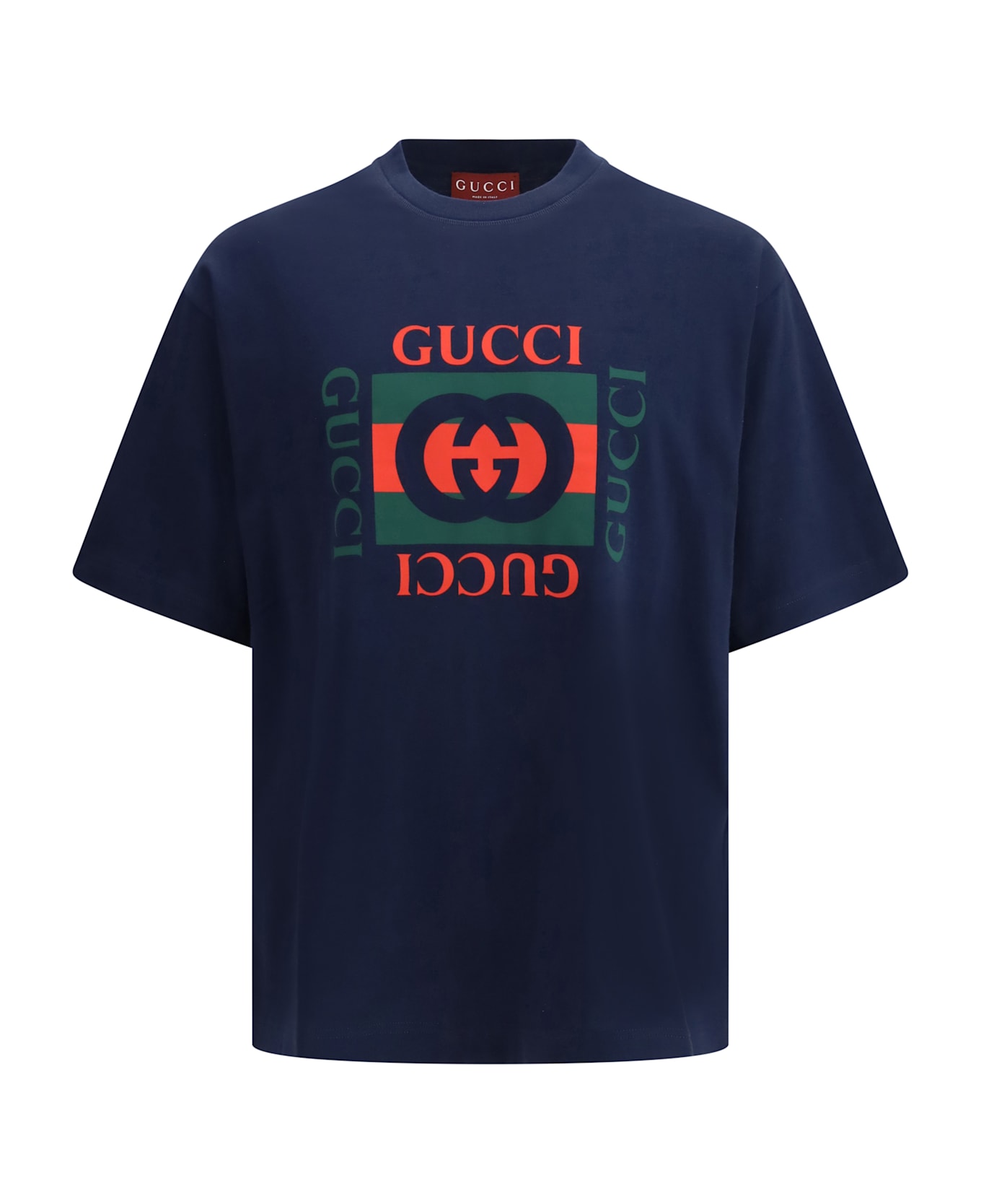 The cotton jersey t-shirt by gucci embodies a contemporary style inspired by the summer spirit and beach clubs of the italian coast, part of the gucci lido line. crafted from navy blue cotton jersey, it features the iconic gucci gg interlocking print, reimagining the house s signature codes with a modern touch. the design is finished with a crew neck, dropped shoulders, and short sleeves, offering a relaxed and versatile fit.