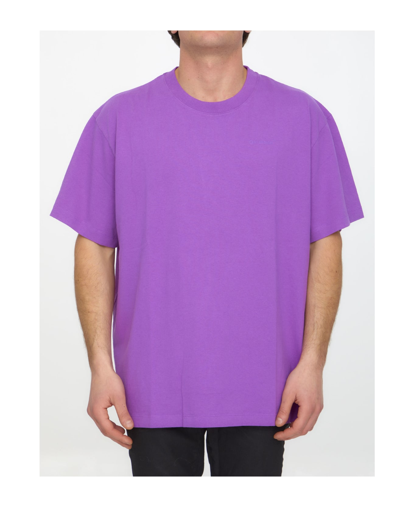 Short-sleeved crewneck t-shirt in purple cotton with tone-on-tone Diag Tab motif printed at the back. Tone-on-tone Off-White logo printed on chest. Ribbed neck. The model is 190cm tall and wears size M.