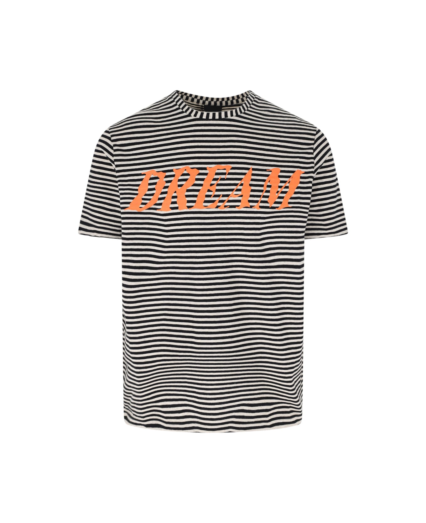 Paul Smith 'Dream' striped T-shirt in black cotton and linen with beige striped pattern, crew neck, short sleeves, orange chest print, straight hem. Composition: 70% Cotton, 30% Linen