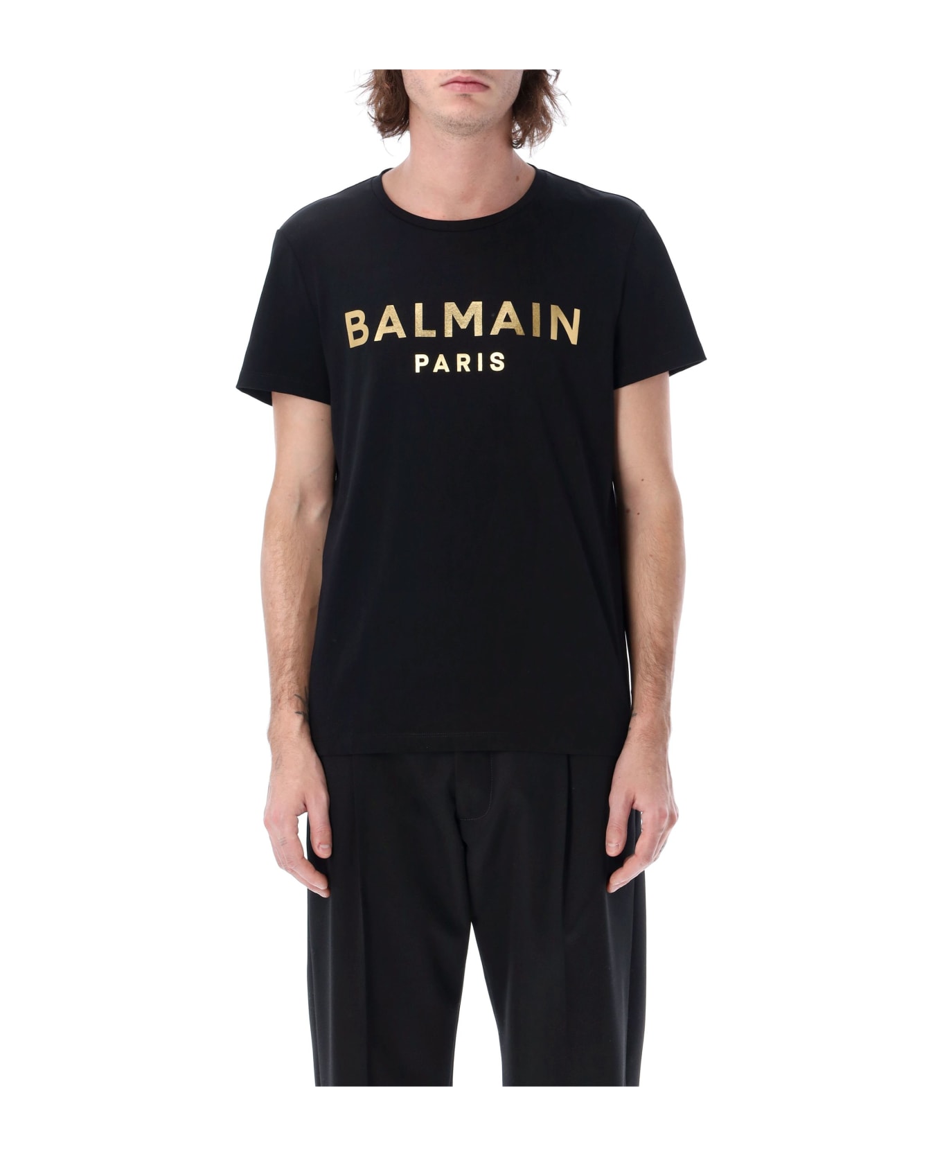 Eco-designed Cotton Logo T-shirt By Balmain. Featuring: Crew Neck Short Sleeves Metallic Balmain Paris Logo Print At Front Straight Cut The Model Is 1,90m Tall And He's Wearing Size L