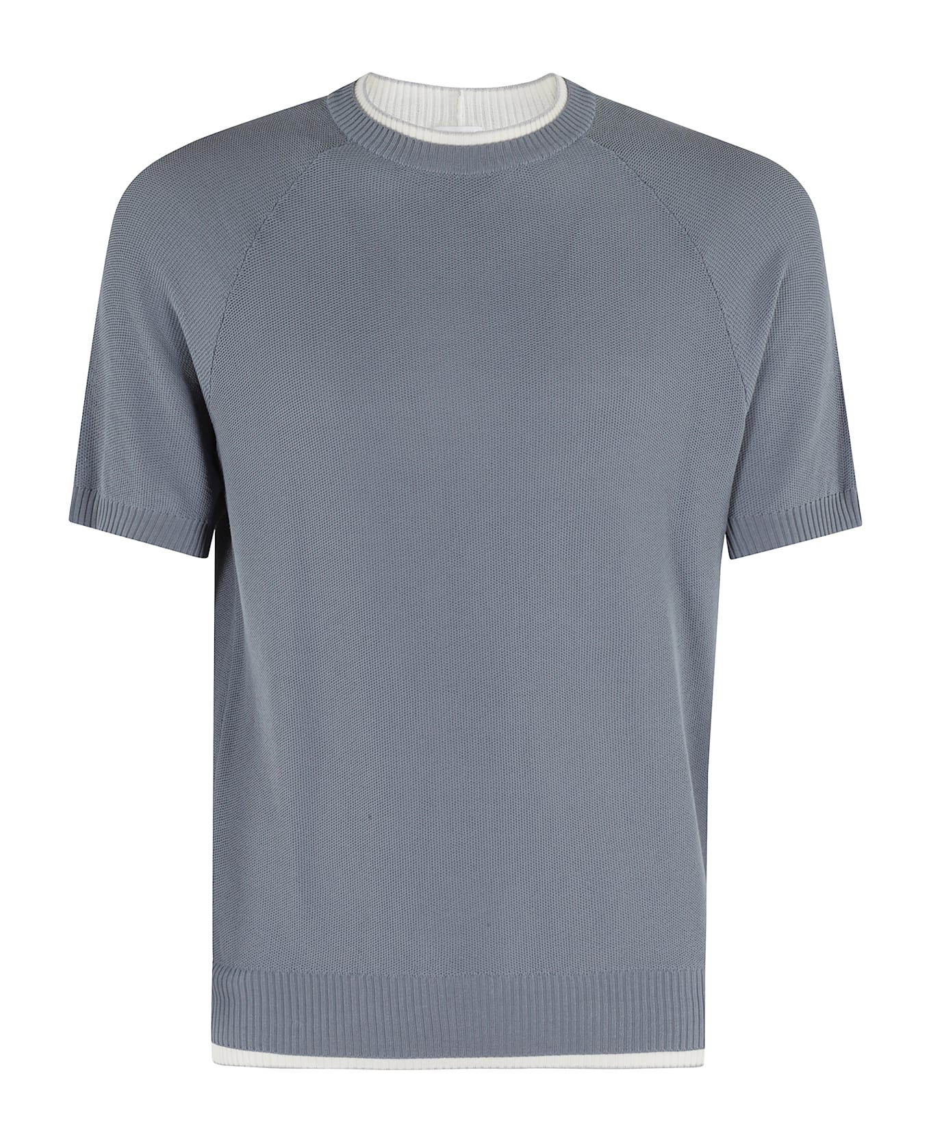 Premium sweater - Eleventy - Denim color - Cotton fabric - Ribbed crew neck with contrasting profile - Short sleeve - Ribbed hem with contrasting profile - Regular fit