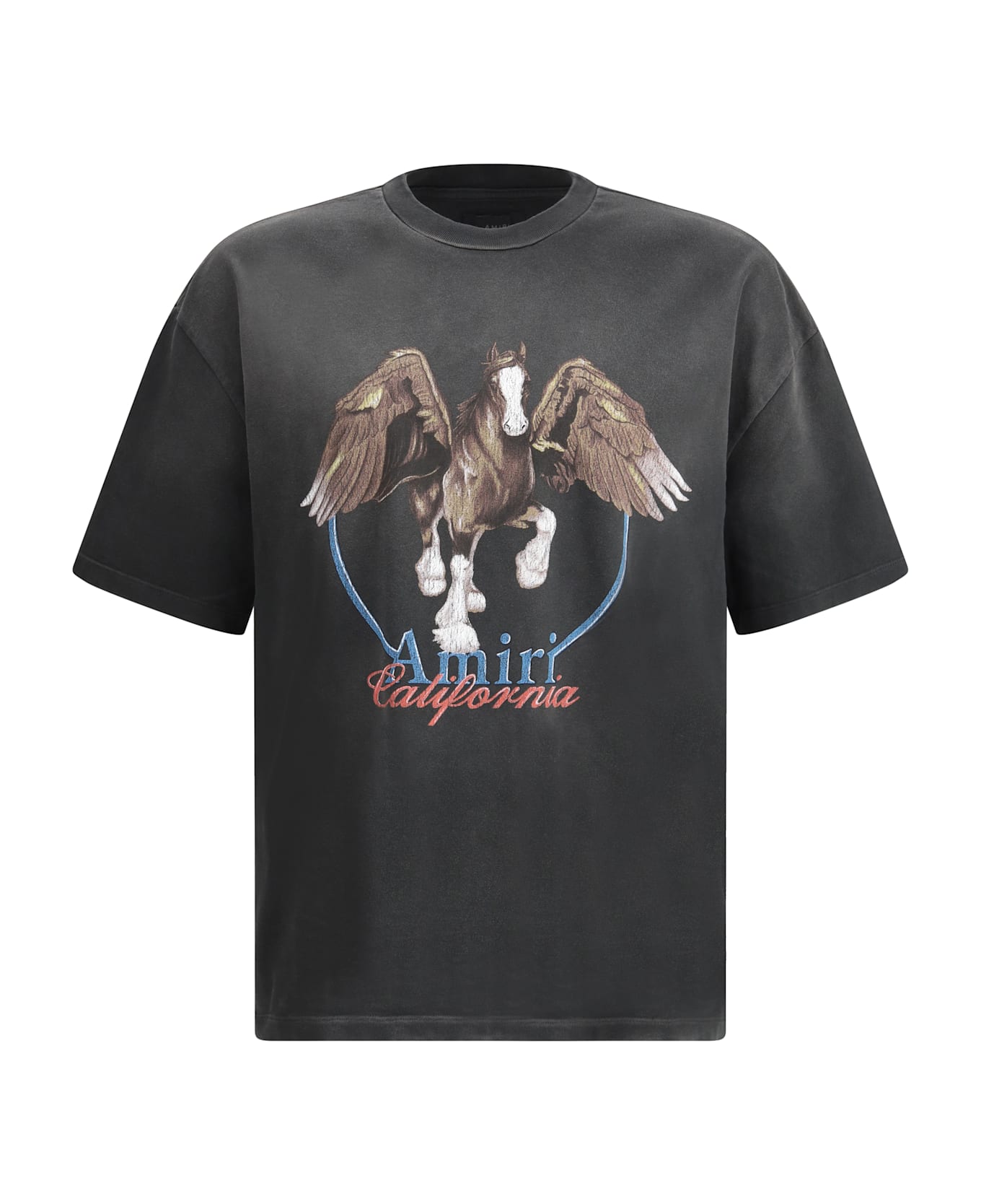 Amiri's cotton pegaso t-shirt is a bold and refined design. the maxi print of pegasus on the front, a symbol of strength and freedom, immediately catches the eye, while the brand's iconic monogram adds an additional distinctive touch. the vintage pattern gives the t-shirt a retro and refined look, while the ribbed crew neck ensures a comfortable and versatile fit.
