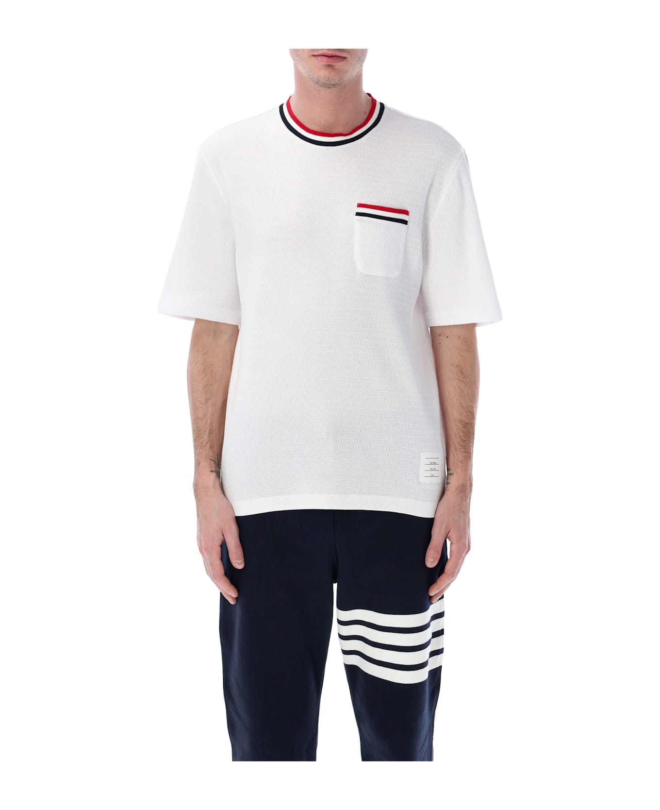 This Thom Browne Short-sleeve T-shirt Expresses A Refined Approach To Everyday Dressing Through Subtle Yet Iconic Details. Crafted In Texturized Medium-weight Cotton Jersey, The Clean White Silhouette Is Defined By Striped Accents On The Ribbed Crew Neckline And Chest Pocket, Delivering A Balance Of Comfort And Graphic Precision. A Versatile Essential Designed To Elevate Casual Looks With Understated Sophistication. Medium-weight Texturized Cotton Jersey