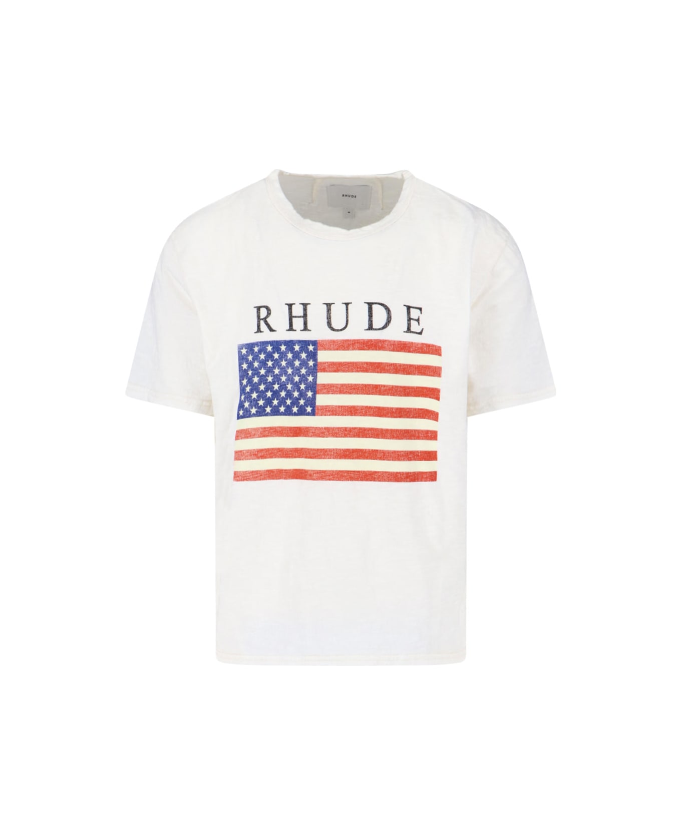 Rhude 'USA' white cotton crew neck t-shirt with short sleeves, maxi multi print on the front, ribbed trims, straight hem.