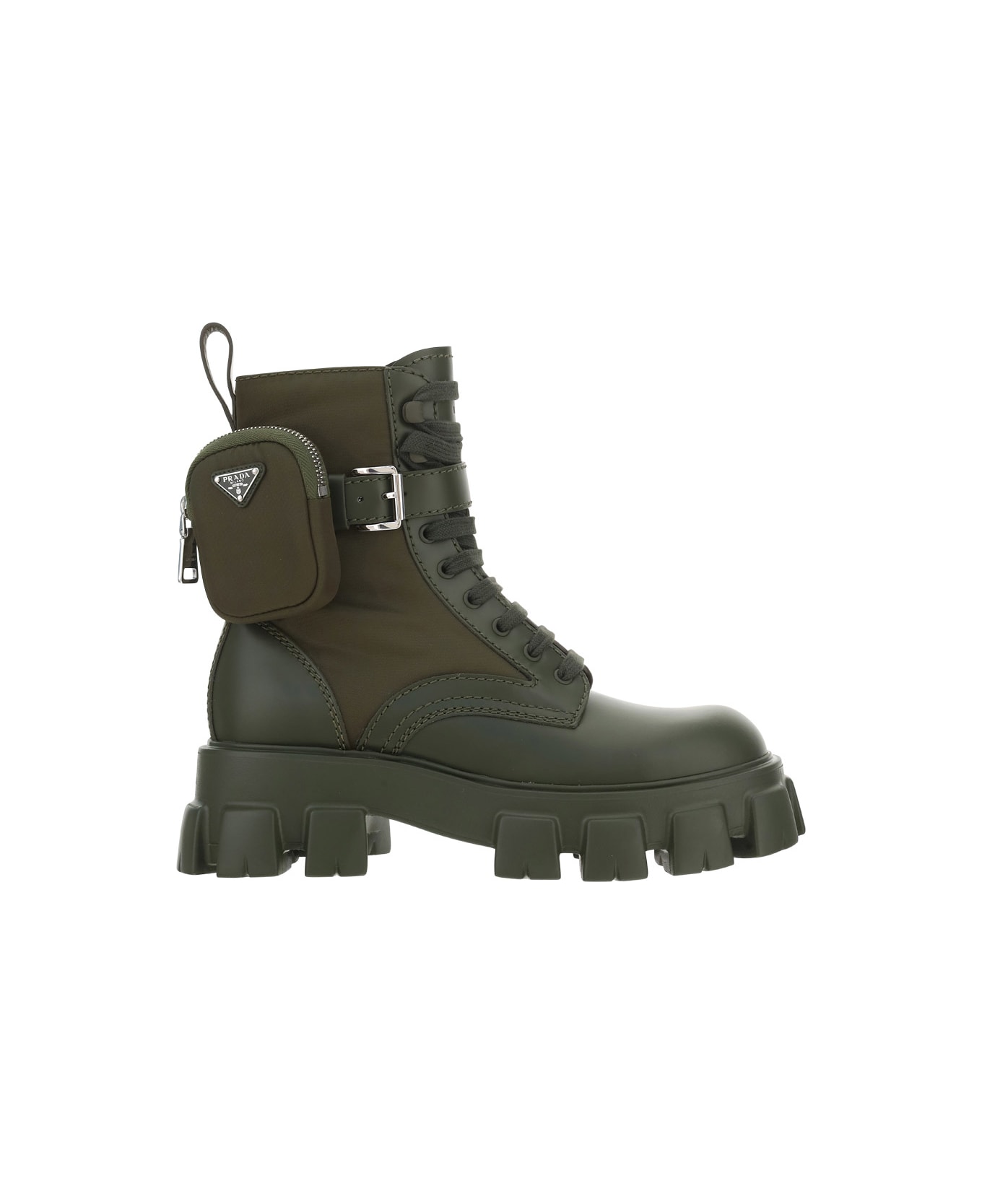 Calfskin boots by prada, round toe, lace-up front closure, iconic brand signature press-stamped on heel, textured sole, leather puller on back, iconic brand signature press-stamped on front tongue, removable ankle lap strap with pouch, pouch with zipper closure, iconic brand triangle embossed on front. Composition: 100% % Calf Leather Bos Taurus, 100% % Rubber