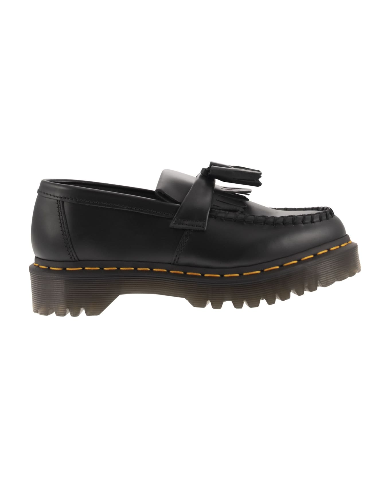 A classic of the 80s counterculture, the Adrian shoe is now making a quantum leap. In fact, these loafers feature the thick Bex sole for a bit more height and character. Made in classic Smooth leather, they are also decorated with fringes and tassels. - Grooved edges - Visible yellow stitching - Fringes and tassels DESIGNER ID: 26957001 BLACK