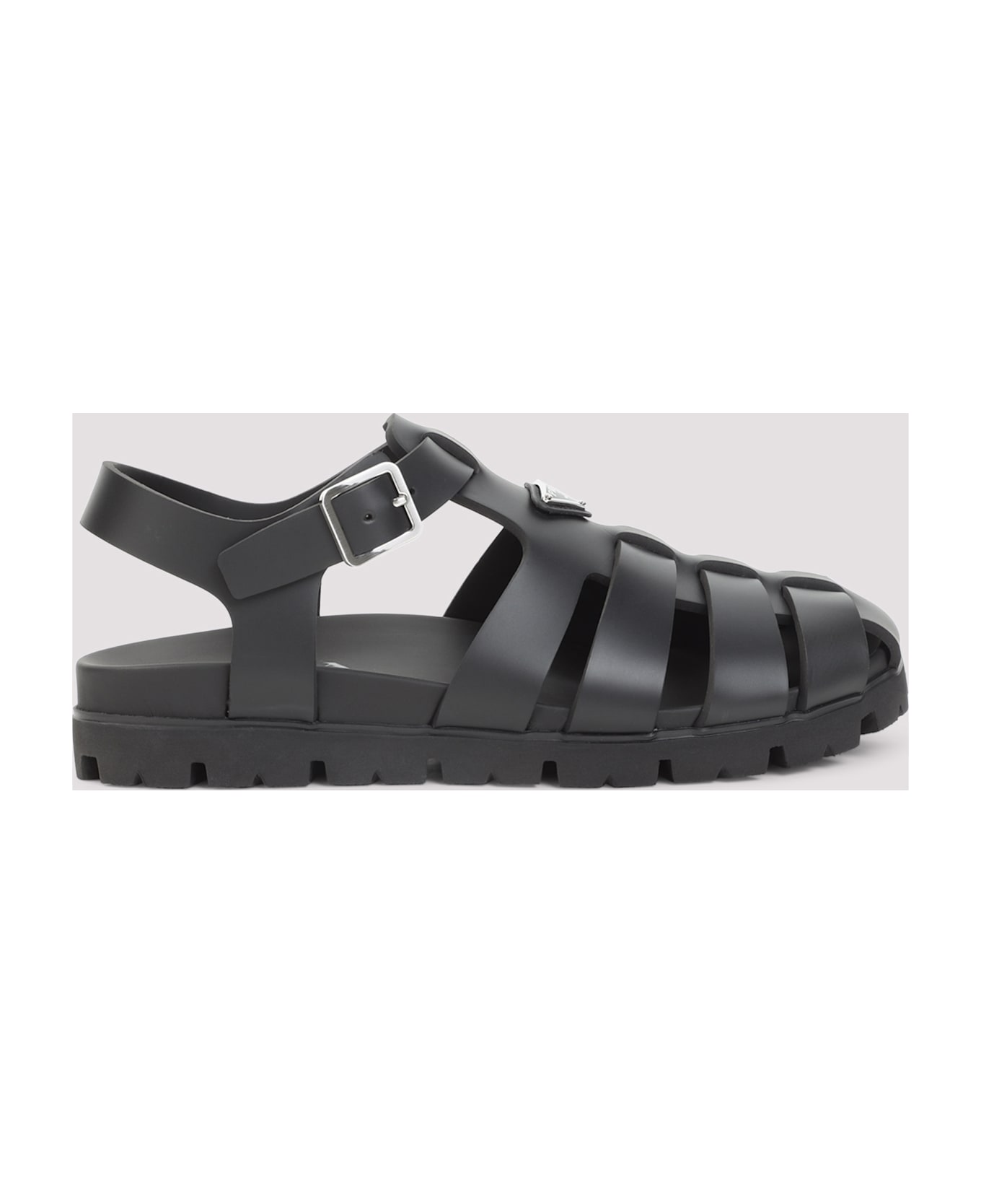 Prada Black Eva Sandals. Pure black eva sandals, round toe, cage design, top tonal straps, top signature triangle metallic logo, adjustable ankle strap, tonal sole.