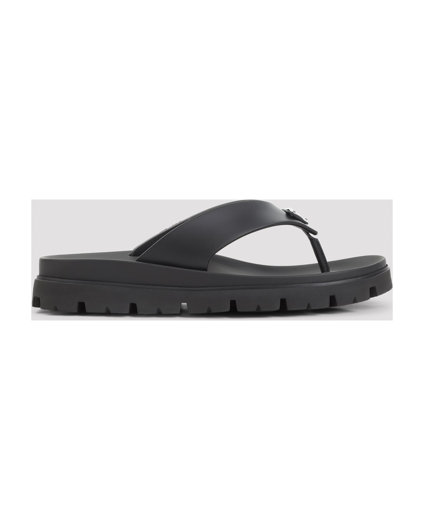 Prada Black Eva Soft Cage Thongs Sandals. Pure black eva sandals, round toe, flip flop design, top tonal strap, top signature triangle logo design, slip-on style, tonal sole.