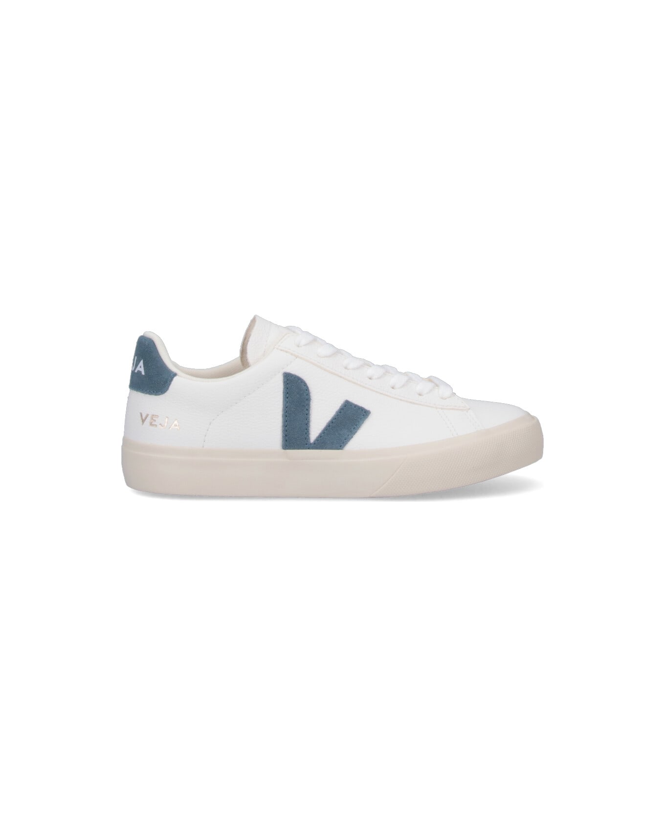 Veja "Campo" sneakers in white hammered leather with suede trim, round toe, lace-up closure, logo embossed on the tongue, blue suede logo patch on the side, blue suede back tab, white logo print detail, gold logo print on the back, rubber sole.