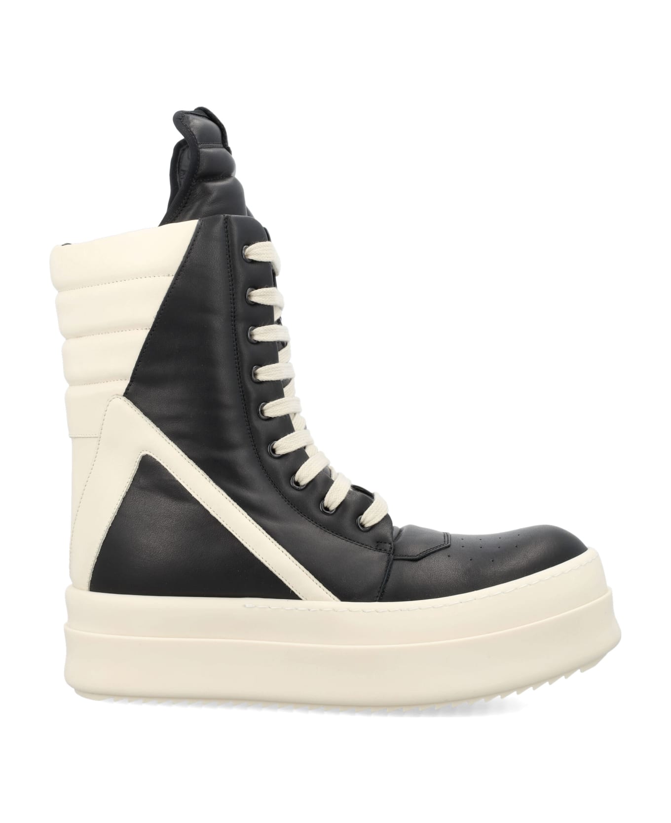 Mega Geobasket Sneakers By Rick Owens. Featuring: Leather Upper High Top Lace-up Fastening 9 Metal Eyelets Extended Toungue With Webbing Tab Signature Geometric Panels Padded Back Counter With Lines Of Topstitching Double Height Mega Bumper Shark-toothed Sole