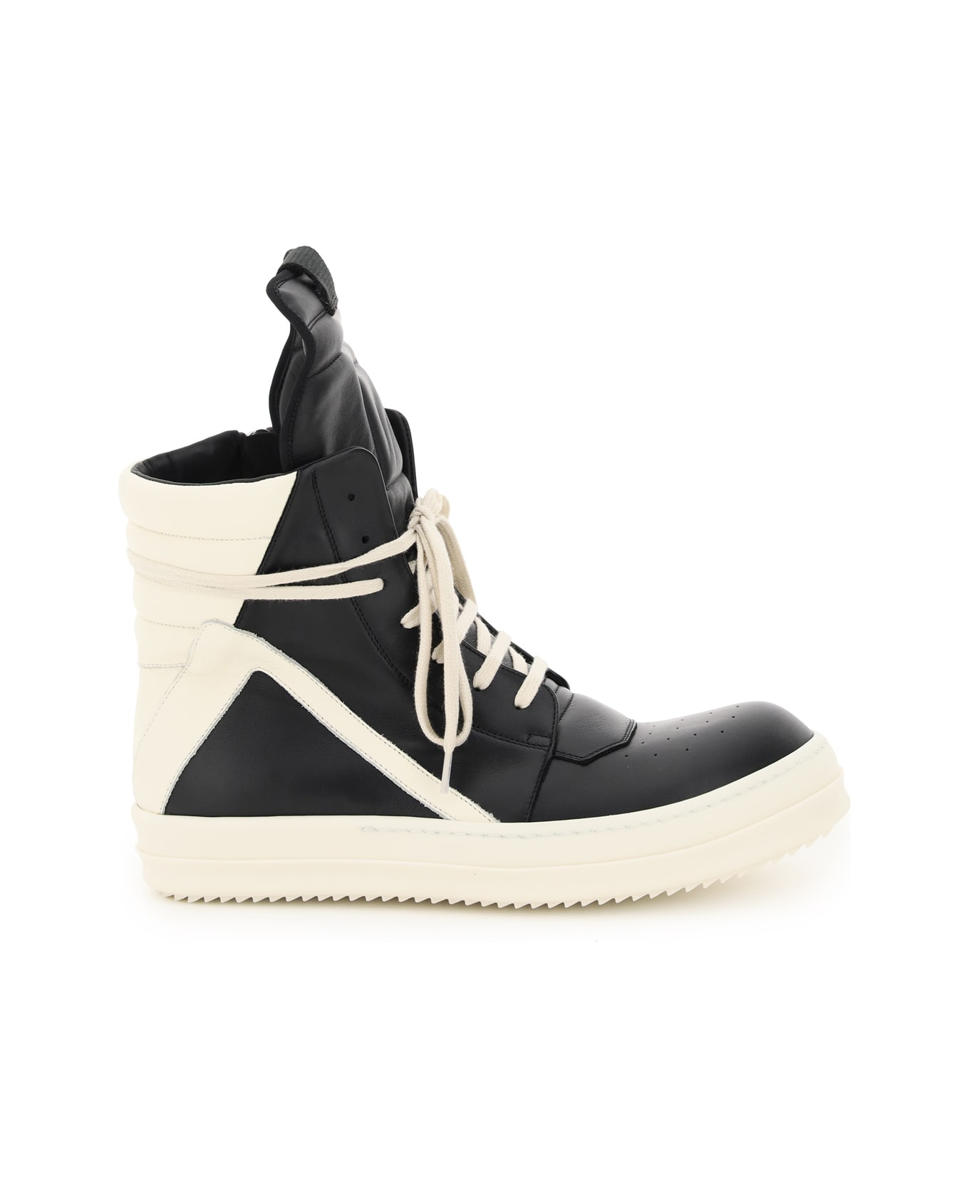 Rick Owens Geobasket sneakers in smooth leather with contrasting back and side details, characterized by the maxi tongue with grosgrain edges and fabric tag. Rounded toe, lace-up closure and side zip in silver-finished metal. Leather lining with removable insole, contrasting rubber sole. Extra laces included.