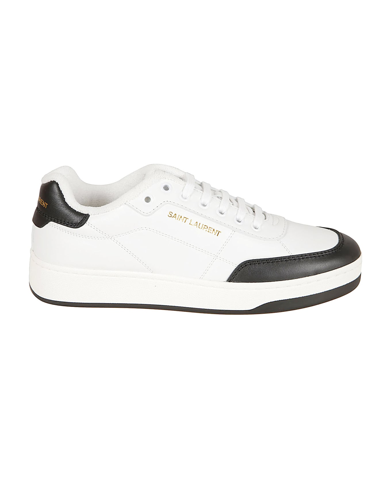 Low-top lace-up sneakers with gold SAINT LAURENT signature on the side and heel counter, and SAINT LAURENT signature appliqué on the tongue. Composition: 100% Domesticated Calf Leather