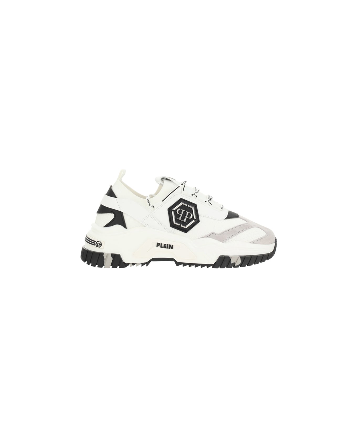 Calfskin trainer predator sneakers by philipp plein, panel design, round toe, front closure with laces, contrasting logo patch on the side, embossed contrasting logo on the sides of the sole, insole with logo and high sole.