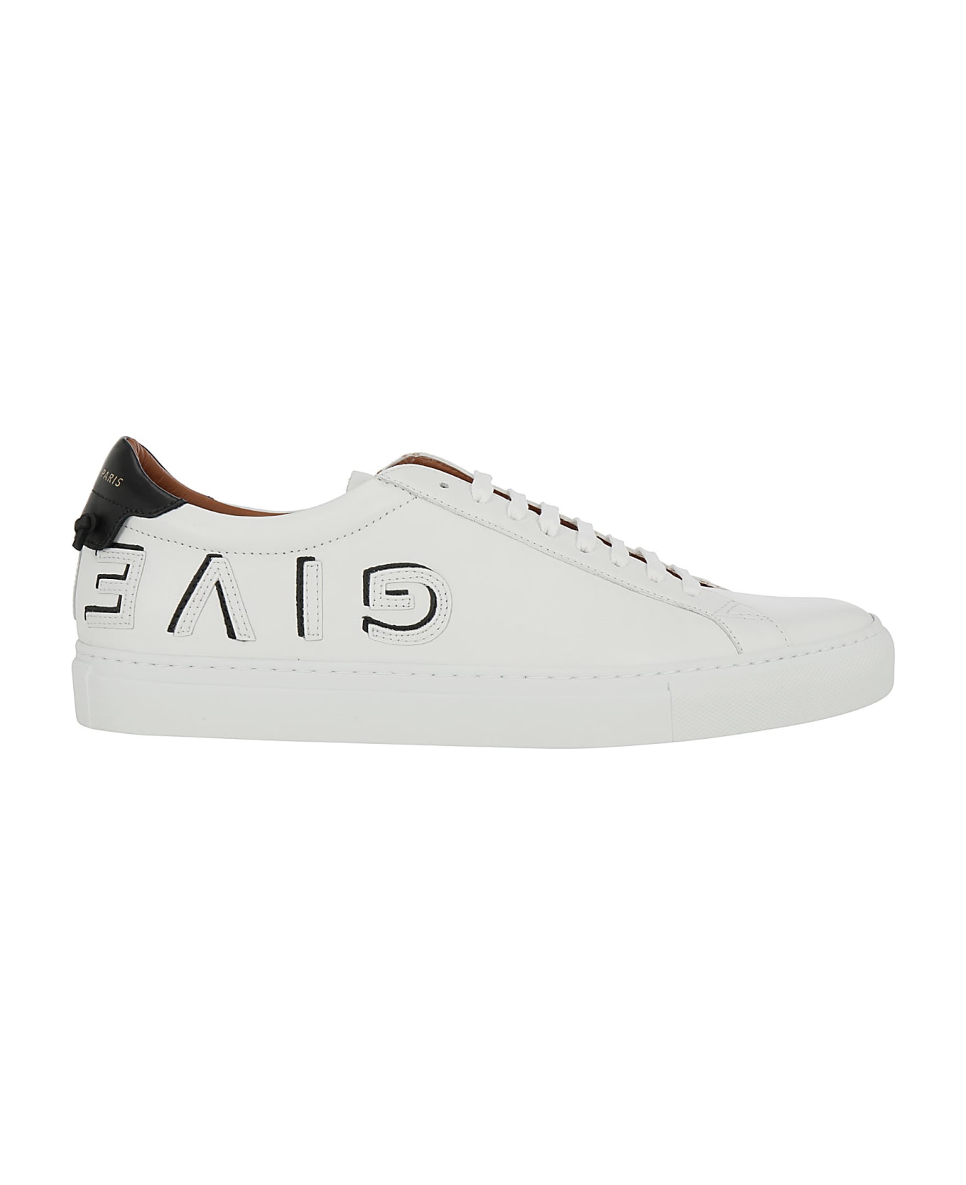 White Calfskin Urban Street Sneakers by Givenchy, round toe, lace up closure, gold-tone logo printed on front tongue, embossed logo on back with black details. Composition: 100% Calf Leather Bos Taurus, 100% Rubber