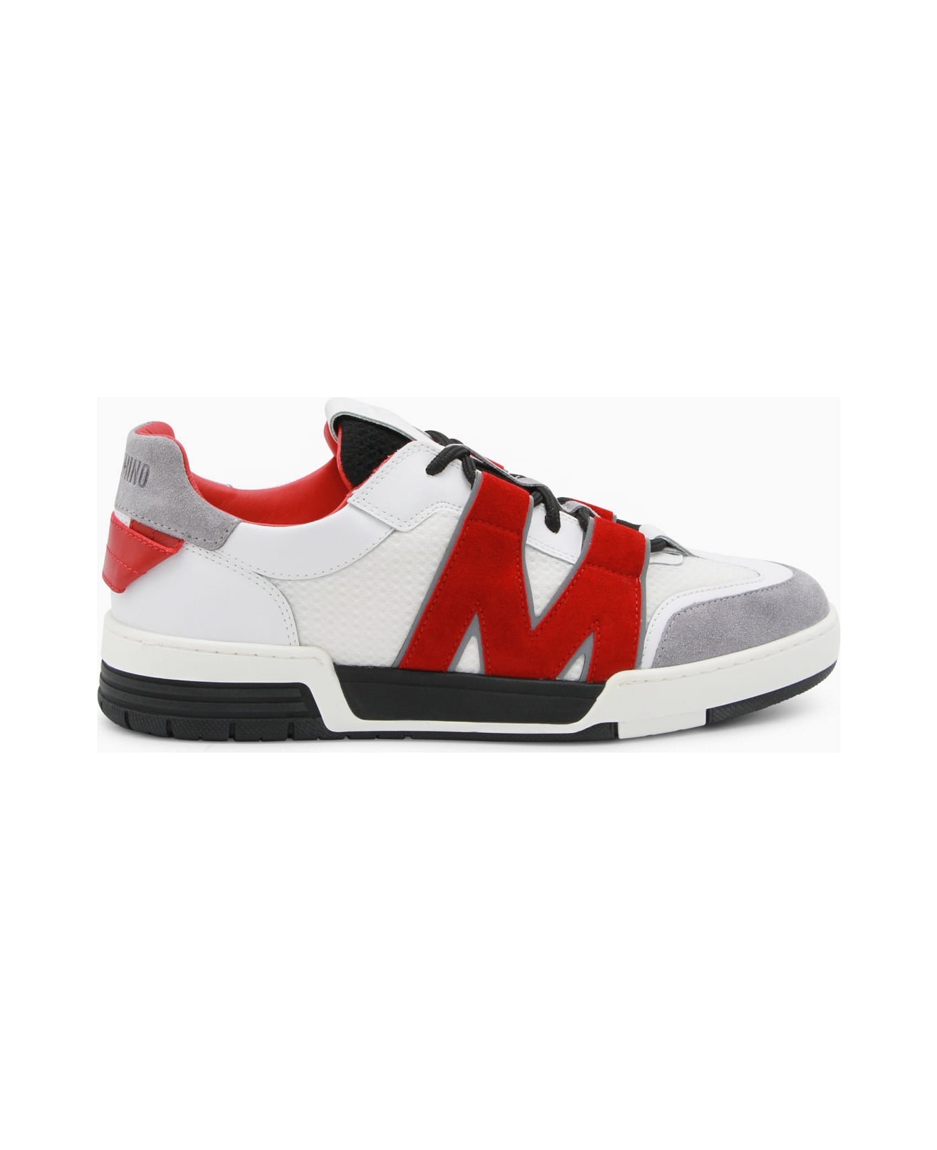 White leather sneakers from Moschino featuring round toe, cotton laces fastening, rubber sole, branded heel, lateral red logo, details and regular vestibility.