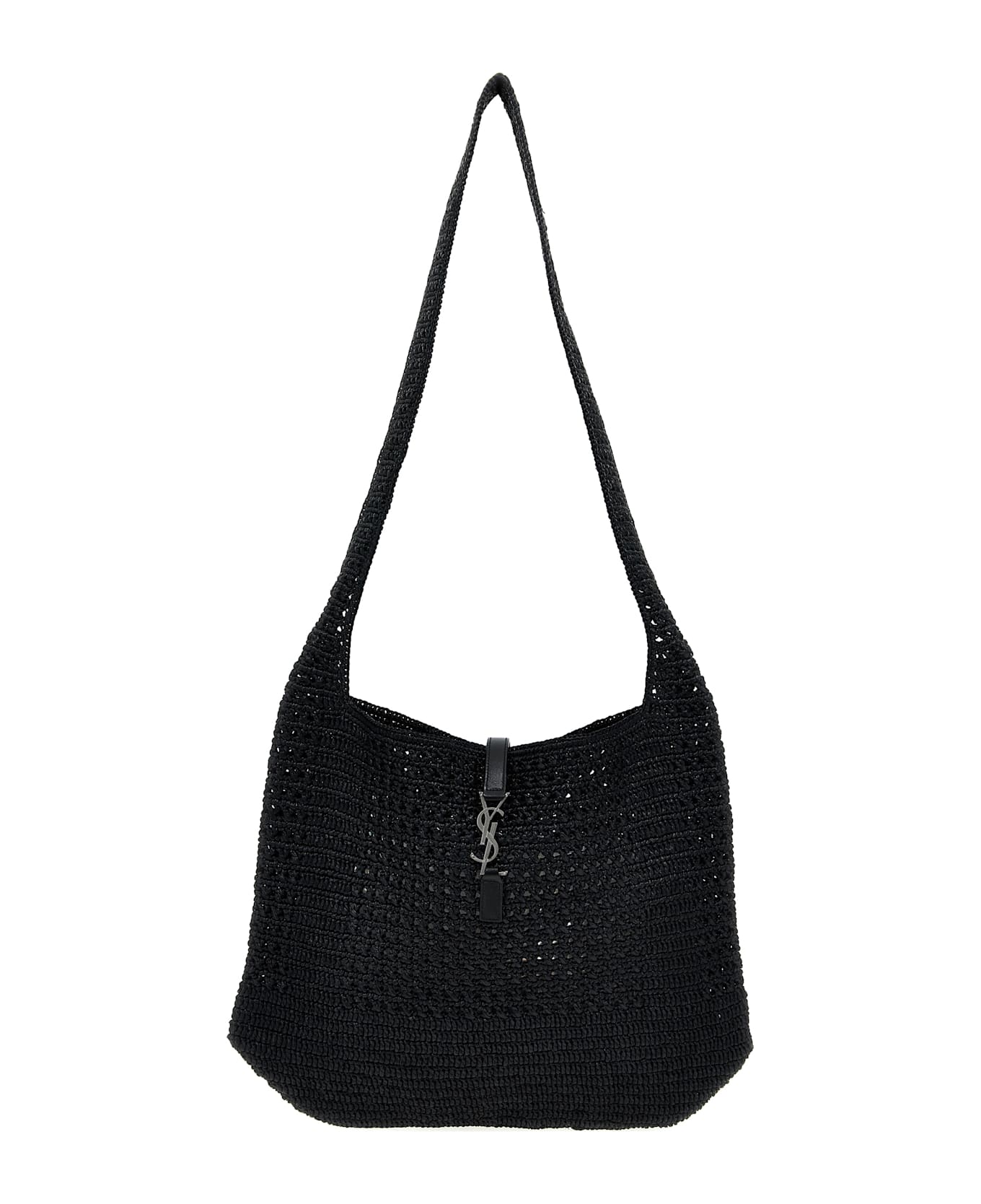 'Le 5 à 7' crochet raffia midi shopping bag, leather tab and metal logo closure, long shoulder strap. Composition: 100% raffia