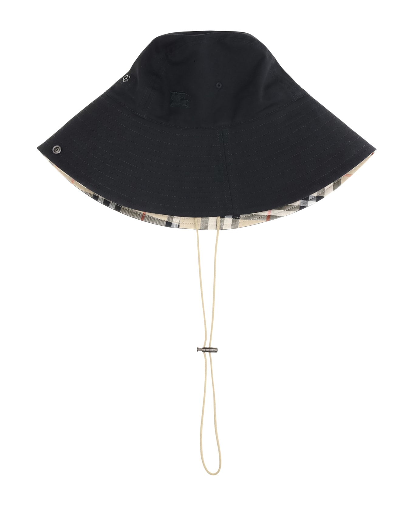 Burberry's bucket hat is a functional and distinctive accessory perfect for casual, contemporary elegance. made of water-resistant cotton gabardine, it features a moldable brim thanks to snap buttons on the front, which allow it to be folded to reveal the iconic burberry check interior. the adjustable drawstring strap ensures a customized fit, while the equestrian knight design embroidered on the side adds a heritage and refined touch.