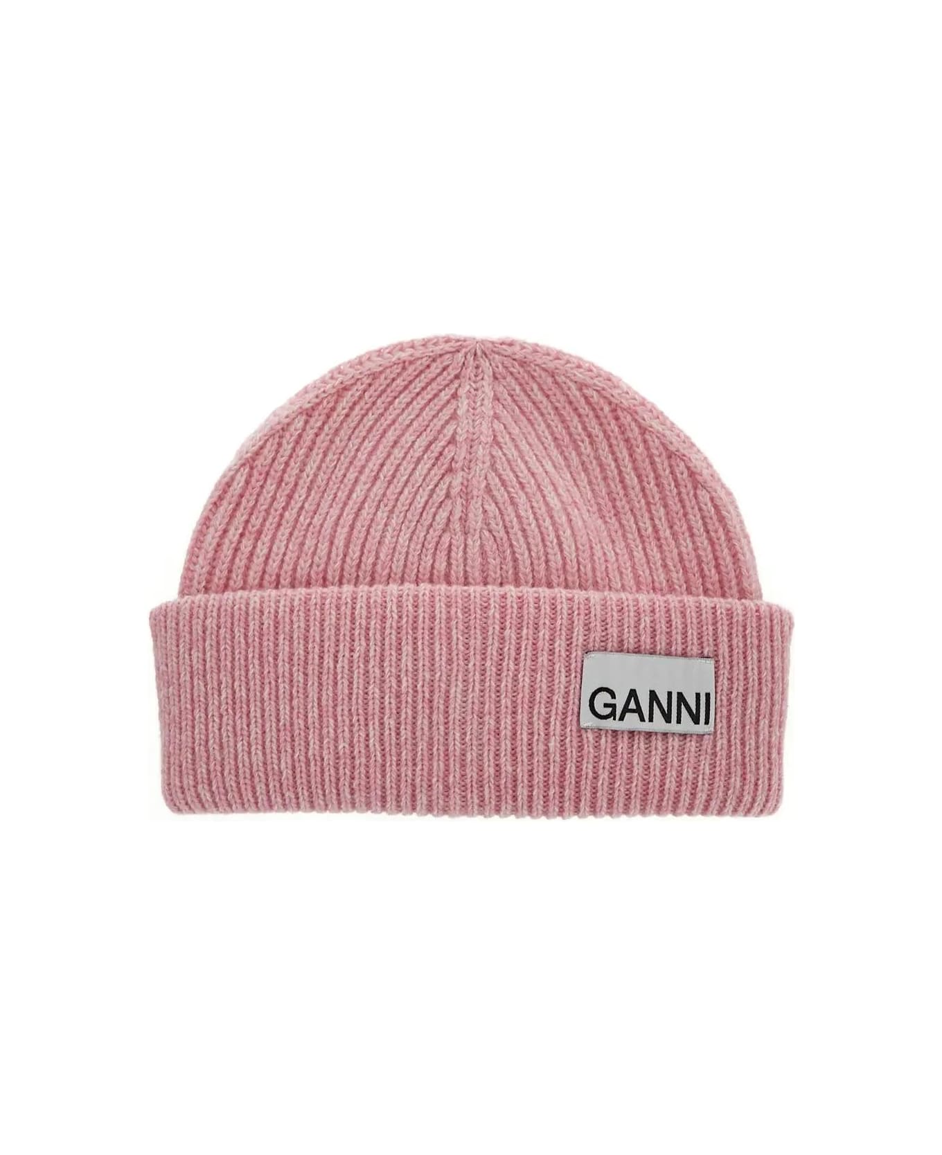 Ganni beanie hat in mauve chalk wool blend with contrasting logo patch and folded bottom.