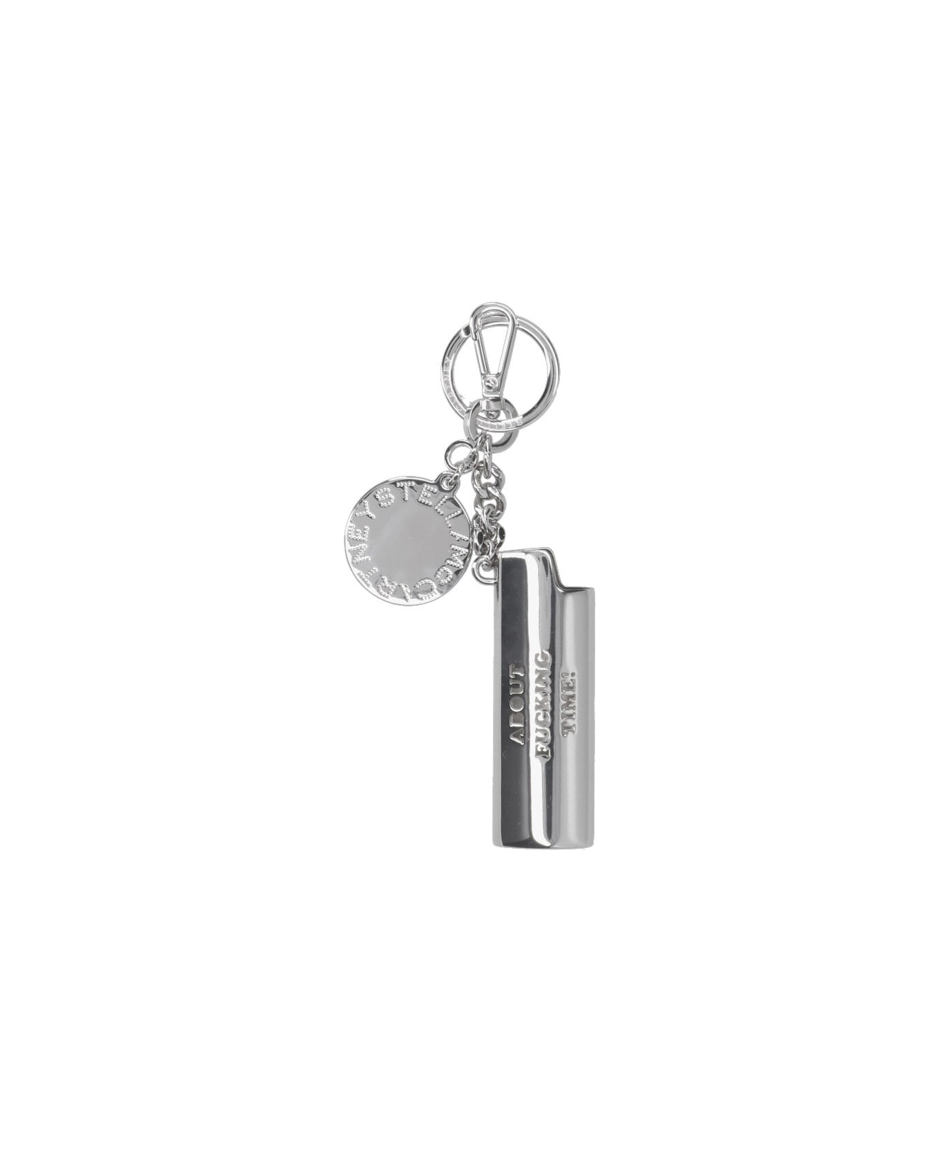 Stella McCartney 'About F*****g Time! ' keyring in silver-plated brass, medallion charm with engraved logo, lighter pendant charm with engraved slogan, ring keyring and snap hook, engraved logo detail. Composition: 100% Brass