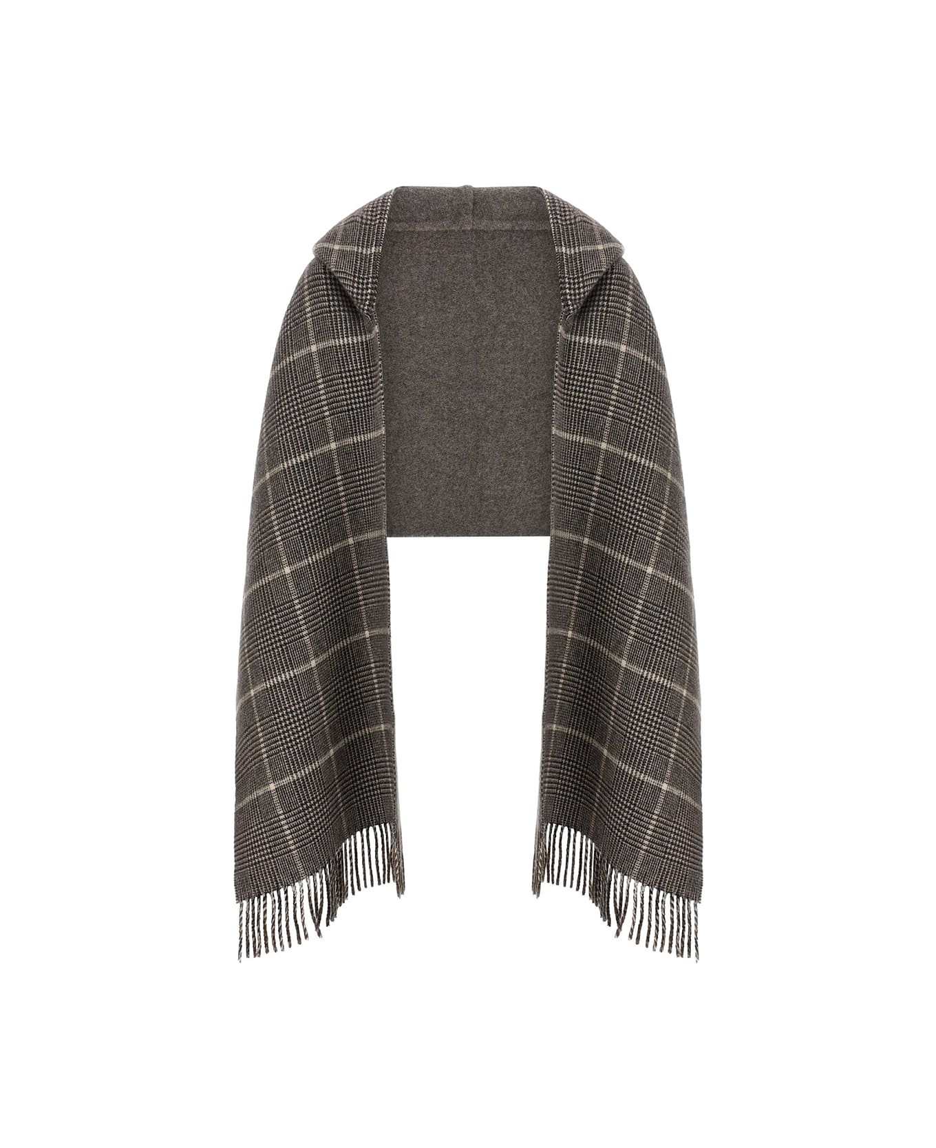 Brown cashmere scarf from Brunello Cucinelli featuring hood, fringes edges and check pattern.