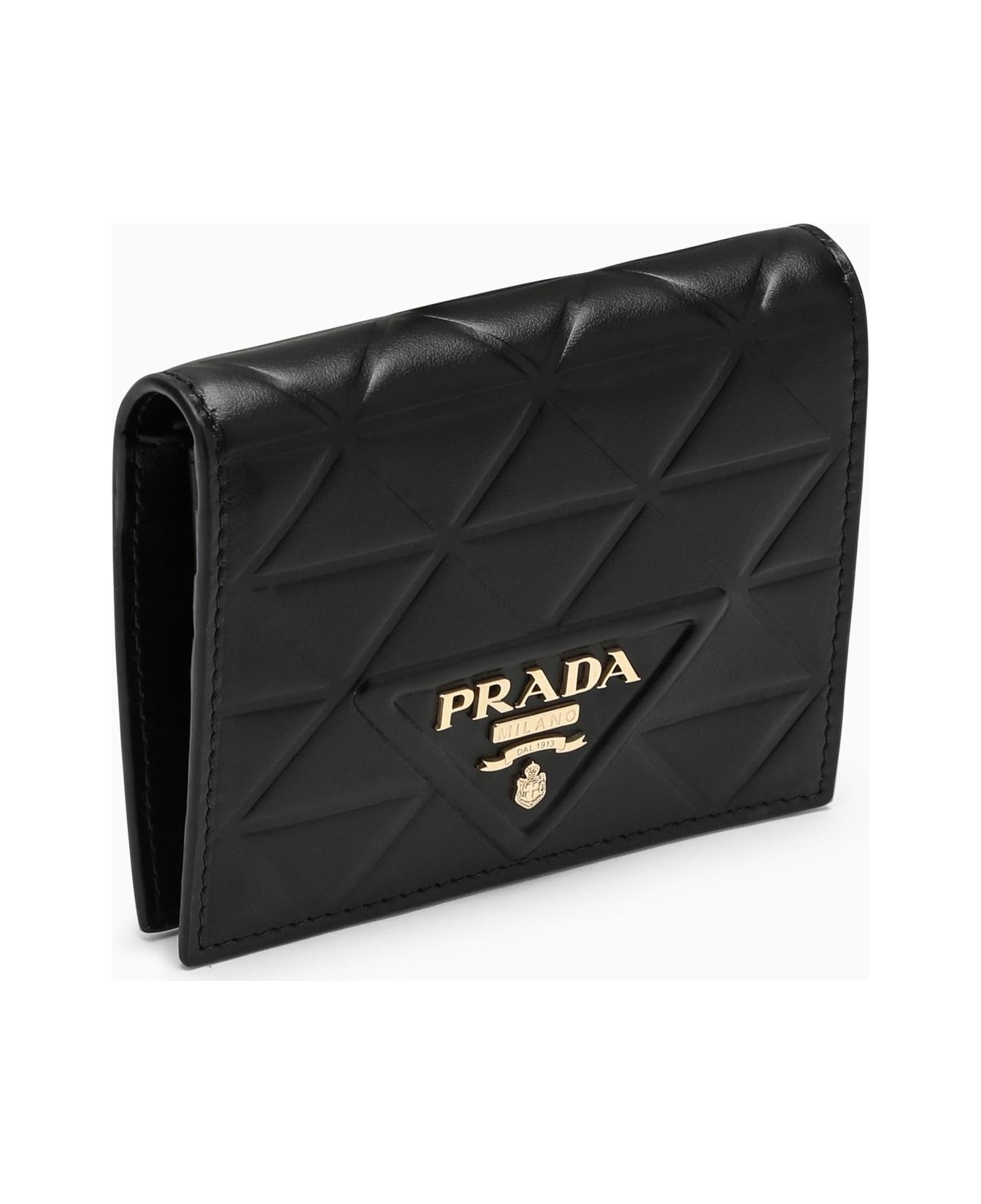 Black leather wallet from Prada featuring a gold metallic logo flap, a button and press stud closure, a flap and button compartment, four card slots, a banknote compartment and gold-coloured metal hardware. Composition: 100% Calf leather