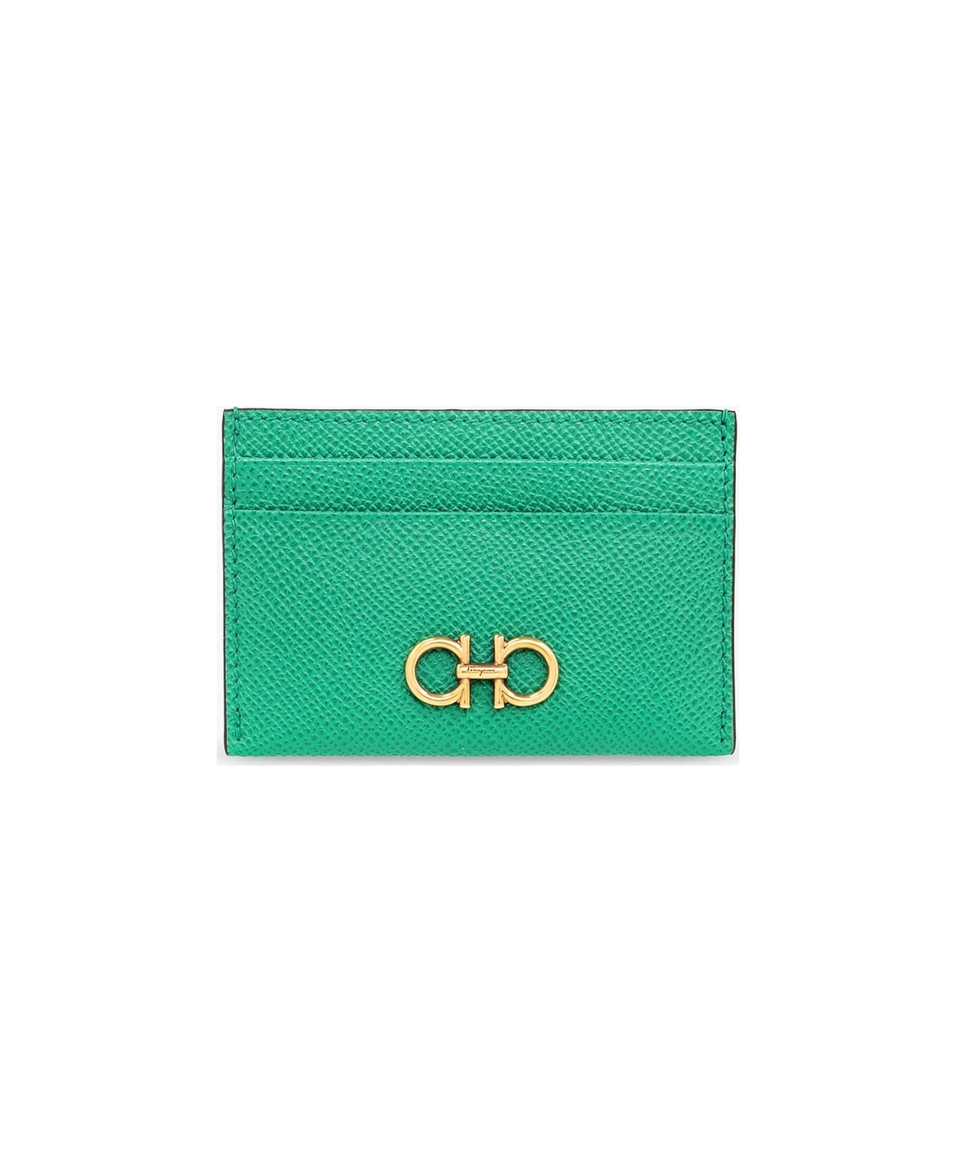 Green card case from Salvatore Ferragamo. Made of leather, this item features gold-tone logo hardware on the front, four card slots and one slip pocket. Composition: 100% Calf Leather