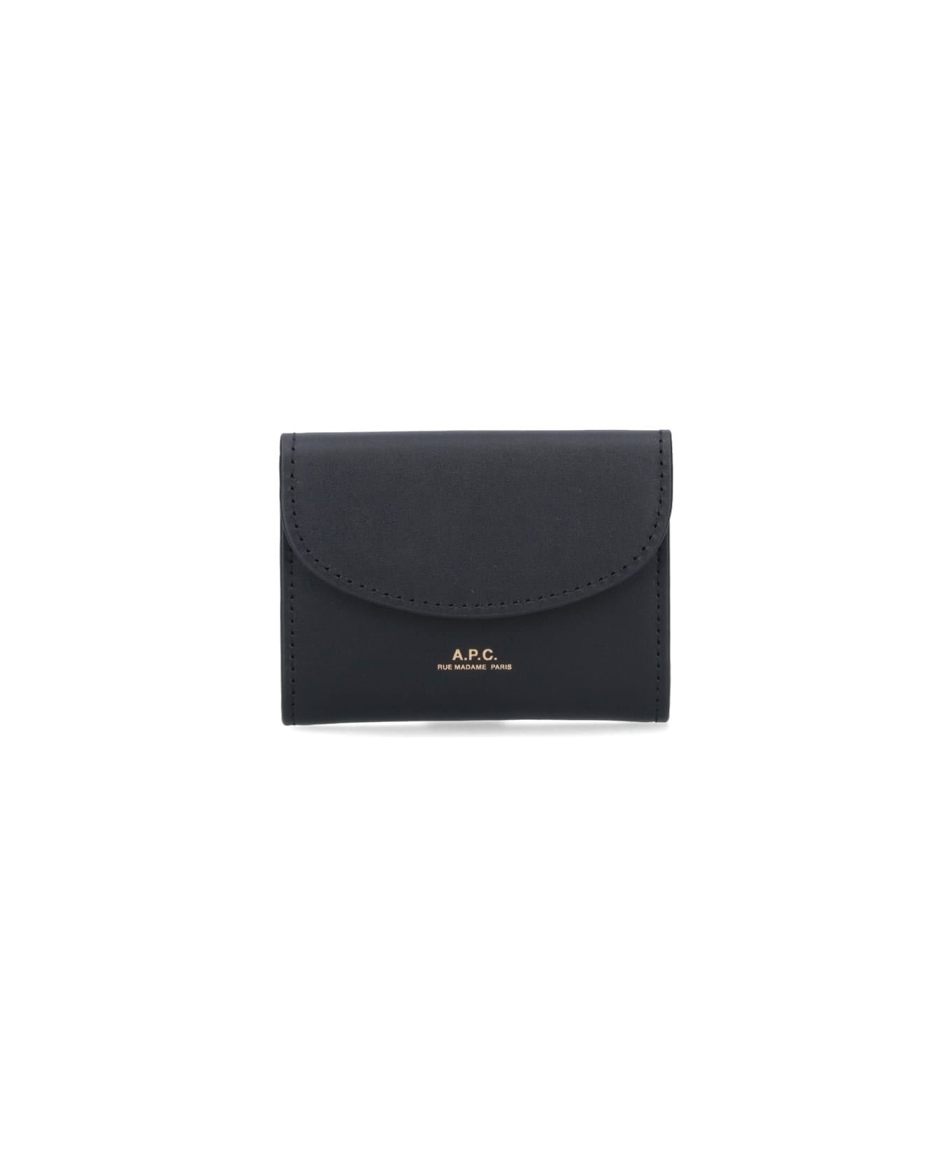A. P. C. Genève business card holder in black leather with snap button closure, gold logo print on front, two card slots on back, and interior single compartment.