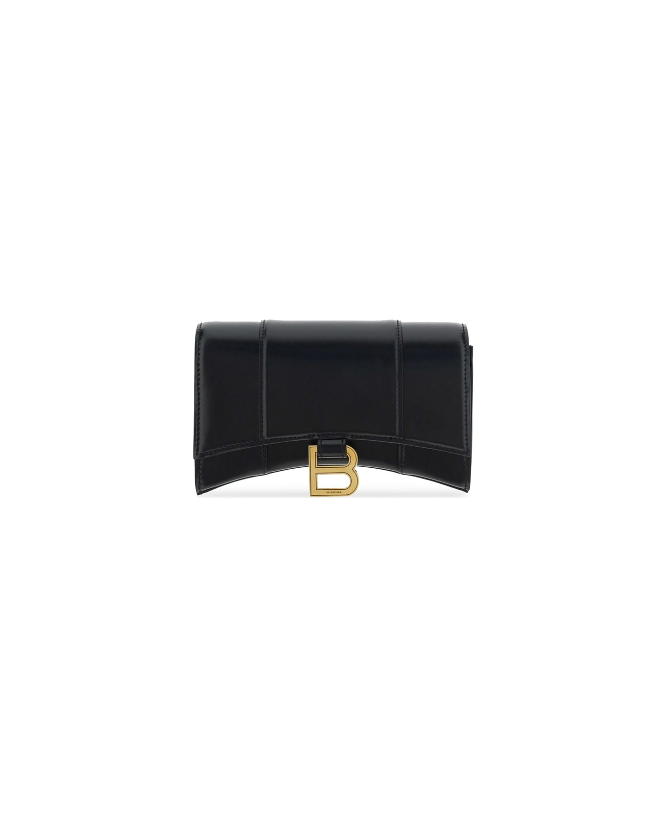 Calfskin hourglass chain wallet by balenciaga, magnetic button flap closure, mongoram logo plaque on front, removable chain shoulder strap, internal card slots, bill compartments with zip pocket.