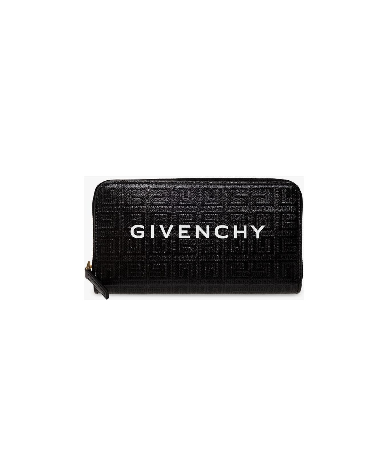 Black wallet from Givenchy. Crafted from faux leather, this design fastens with a zipper and features a monogram pattern, a printed white logo on the front, gold-tone metal hardware and two bill compartments, one zip coin pocket, two slip pockets and twel