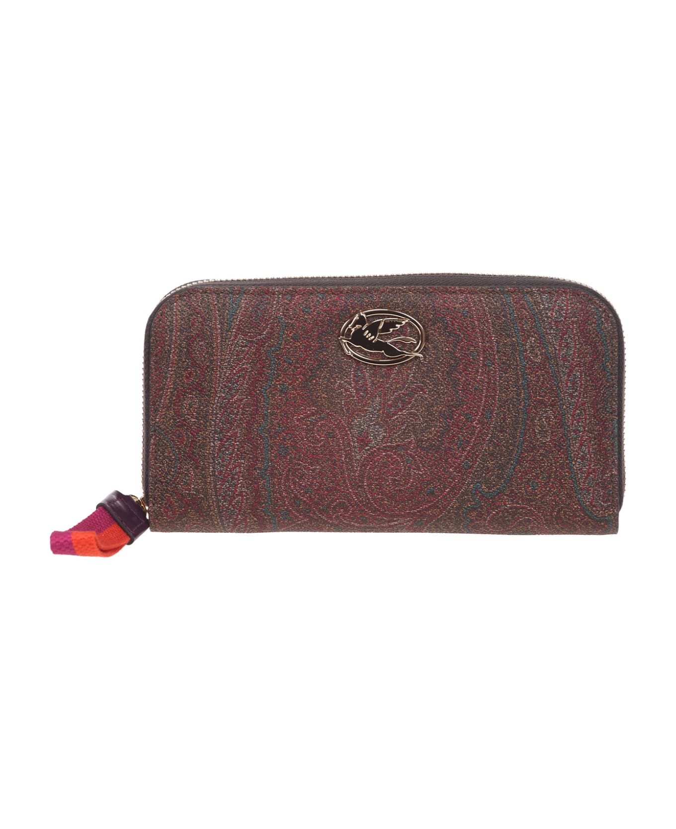 Etro wallet made in the iconic Paisley jacquard fabric and embellished with the Pegaso logo, the winged horse symbol of the Maison. Zip closure. Twelve card slots. Coin purse with zip. Two compartments for paper money. Metallic accessories with gold-colored finish. Dimensions: 19 x 10 cm. Exterior: Paisley jacquard cotton fabric coated with opaque grain and lined with canvas, (76% cotton 24% polyester). Details: 100% calf leather. Lining: 100% nylon. Made in Italy.