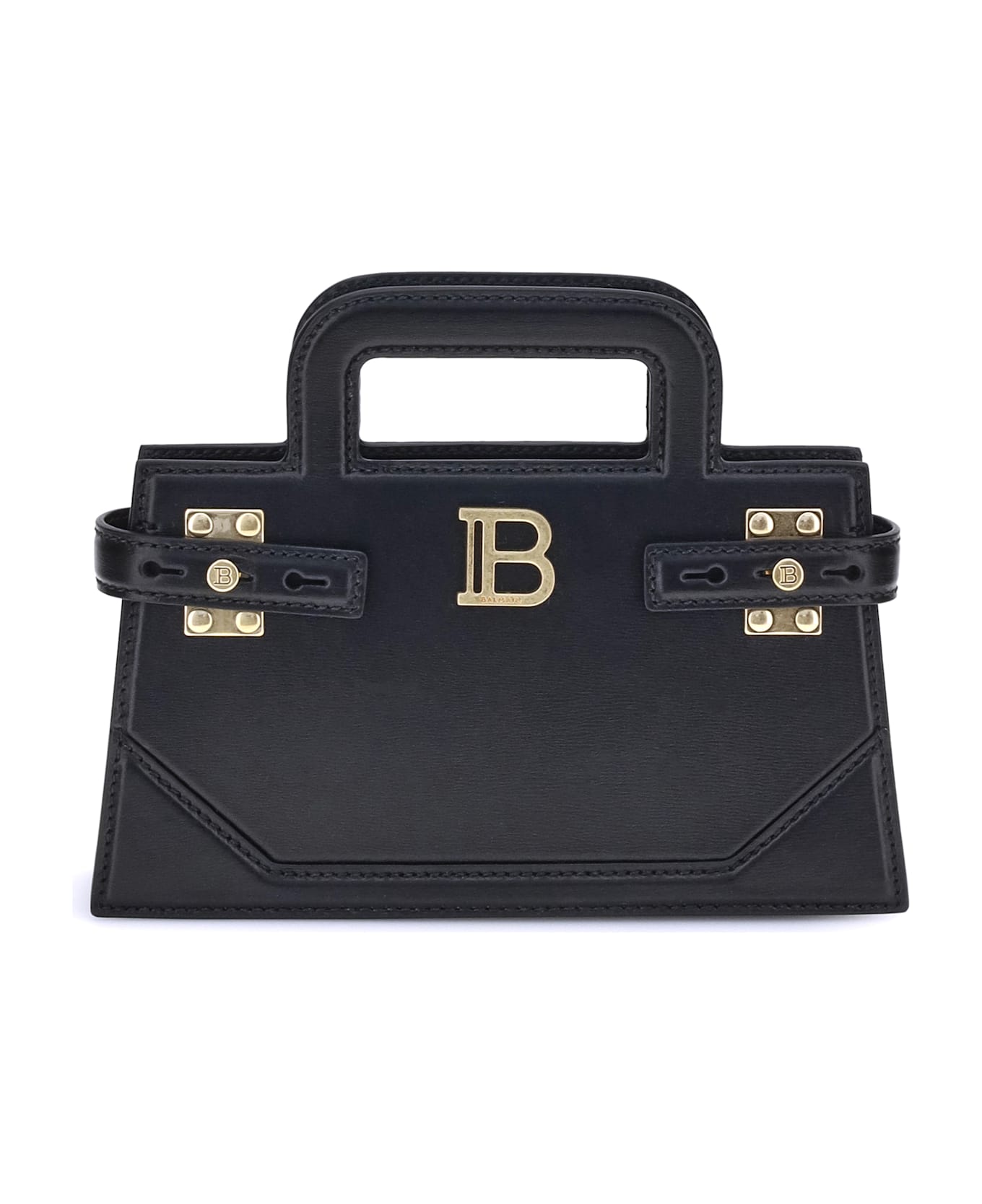 Balmain's b-buzz small handbag features two top handles and a removable chain strap, adding to its versatility. the metal "b" logo, the brand's distinctive symbol, stands out on the front. side buckles adjust the width and closure of the panels, lending a personalized touch to the design. inside, a single compartment with card pocket offers practicality and order. a stylish and functional accessory, perfect for any occasion.