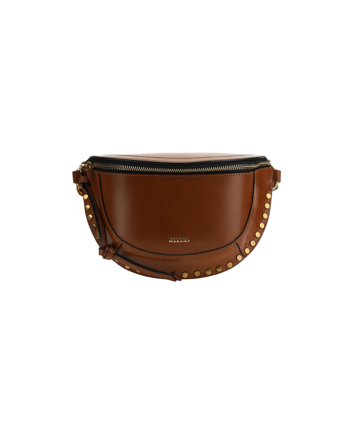 Calfskin skano shoulder bag by isabel marant, front zip fastening, leather tassel zip attached to slider, welt pocket on the back, adjustable and removable shoulder strap, brass-plated hardware, iconic brand monogram printed on the front, all-over contrasting flat studs, inside welt pocket.