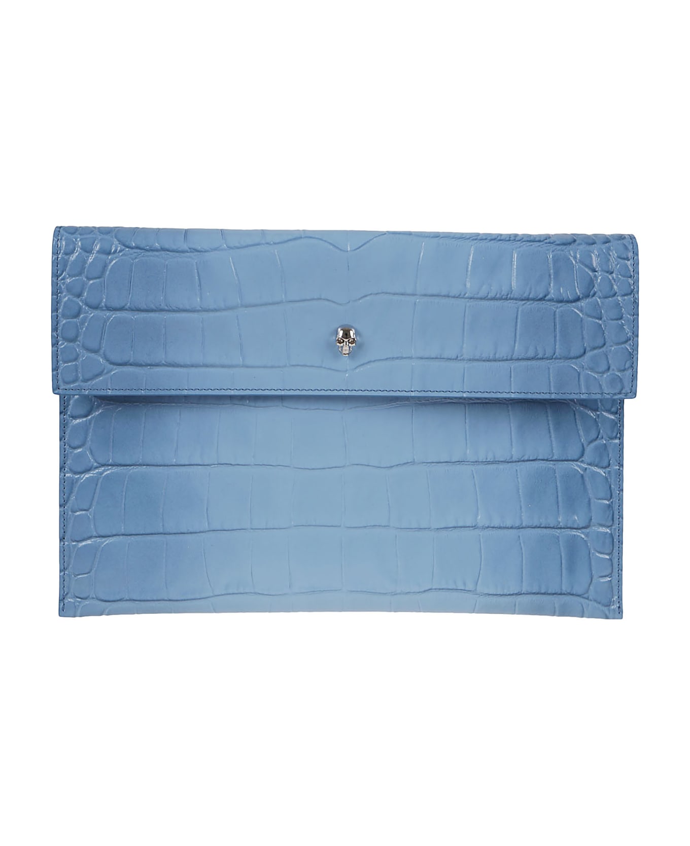 Leather envelope clutch BY ALEXANDER MCQUEEN. Made of crocodile-effect calfskin, front button closure. Characterized by Skull, symbol of the brand on the front.