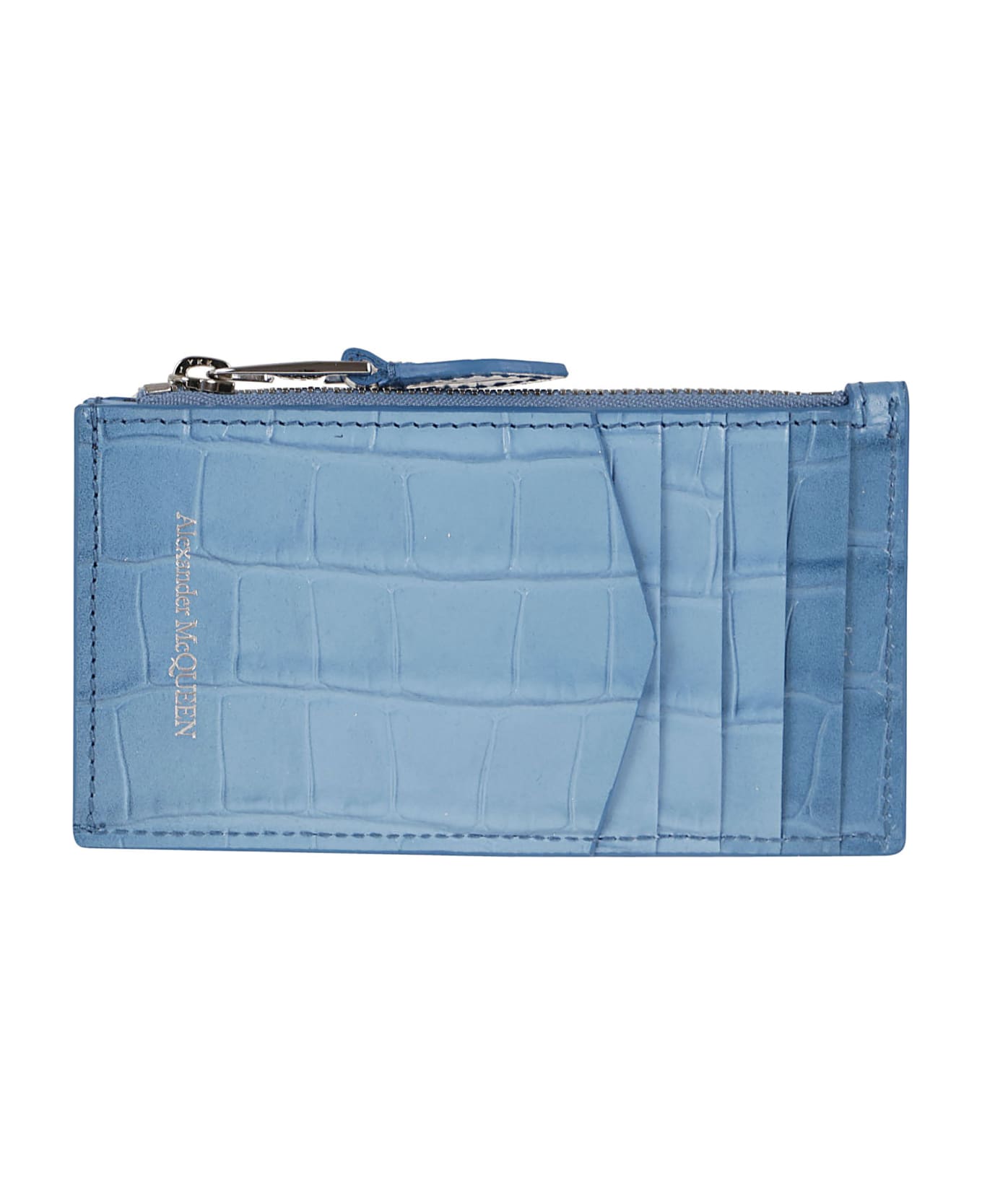 Leather wallet BY ALEXANDER MCQUEEN. Zip closure at the top; card slots on the front. Embellished with Skull, the brand`s symbol on the front. Made of crocodile-effect calfskin.