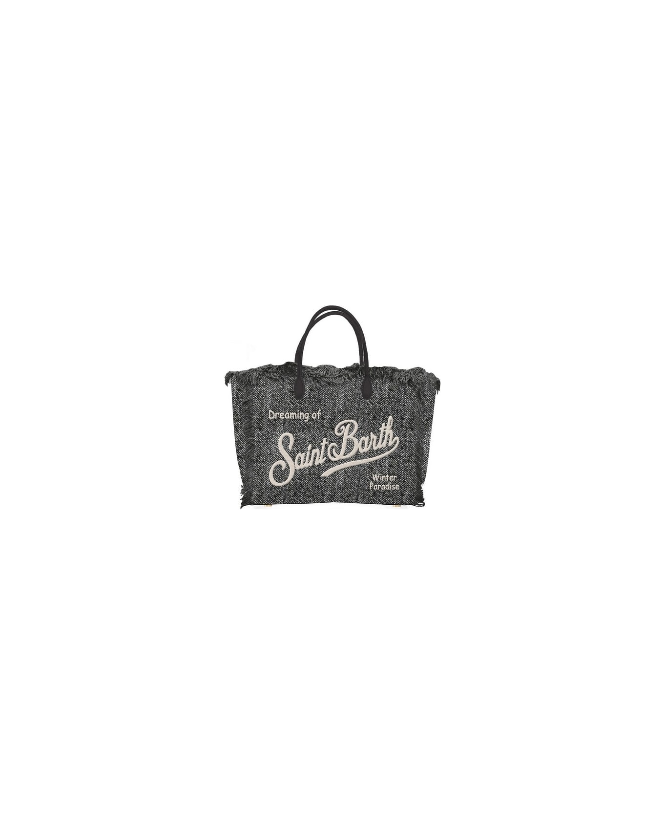 Grey Colette bag from Mc2 St. Barth, in wool-effect fabric with contrasting embroidered logo writing and fringes along the profiles. Brown eco-leather handles and internal flap and zip closure. Wall pocket with zip closure. Long adjustable and removable shoulder strap with snap hooks. Adjustable and removable shoulder strap 100cm. Dimension: 24 x 35 x 12cm. Composition: 95% Polyester 5% Polyurethane
