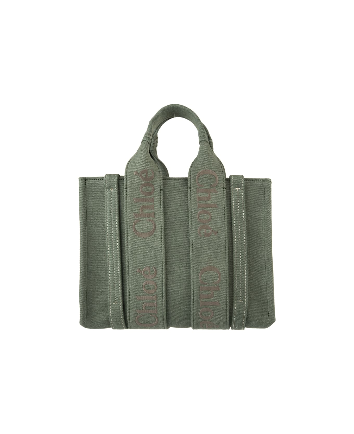 Green Woody small shopping bag by Chloé crafted from refined dotted cotton canvas and embellished with green Woody ribbon and tone-on-tone shiny calfskin stripes. This model features a compact design, two short handles, a detachable and adjustable shoulder strap and a spacious internal compartment with a flat pocket. Article supplied with dust bag.