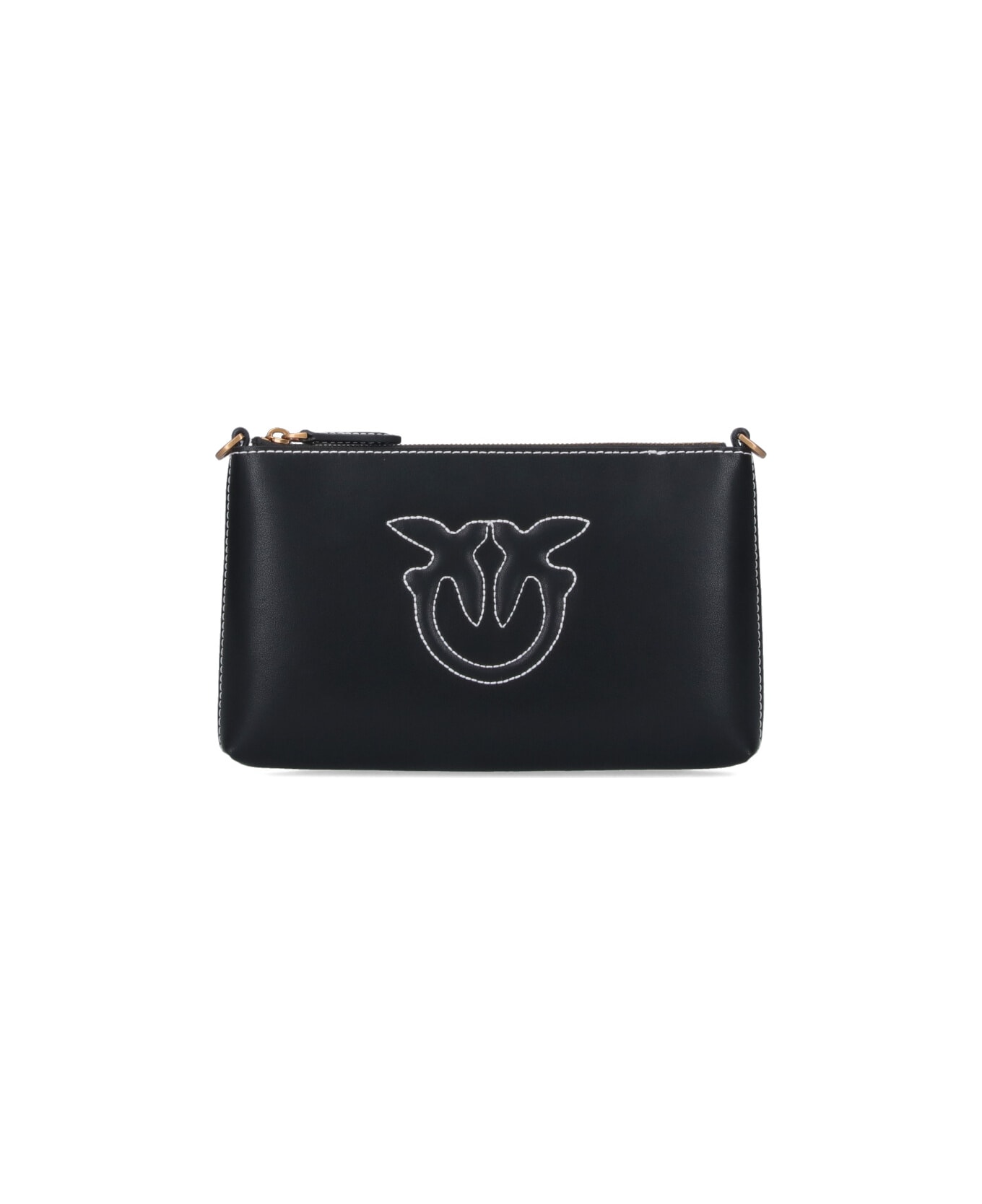 Pinko logo clutch bag in black leather with adjustable and removable shoulder strap, zip closure, contrasting embossed "Love Birds" logo stitching on the front, contrasting "Love Birds" logo stitching on the back, inner zip pocket, main inner compartment.