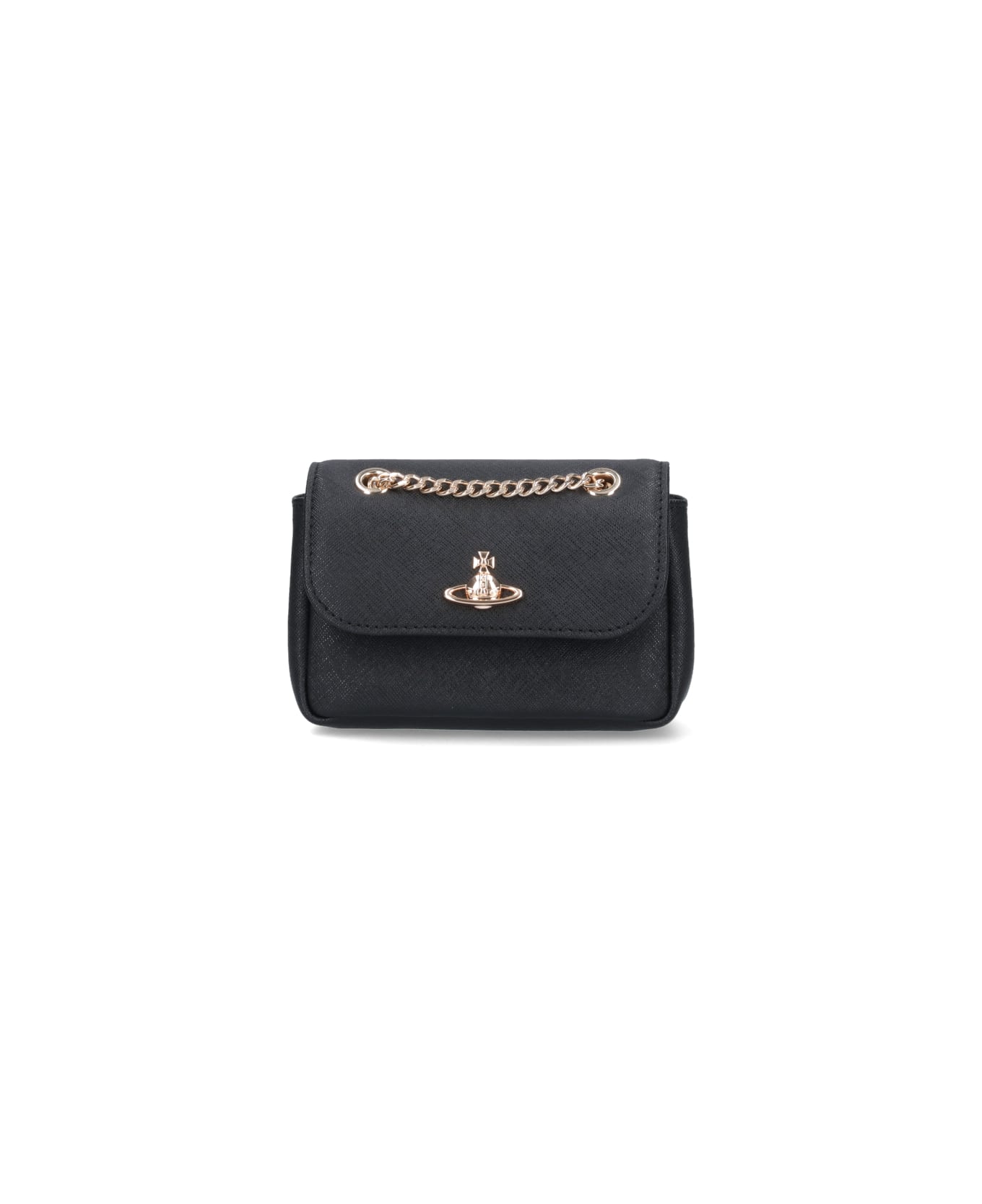 Vivienne Westwood logo crossbody bag in black Saffiano-effect leather with gold metal details, chain shoulder strap, Orb logo plaque on the front, snap button flap closure, main inner compartment. Composition: 100% Leather