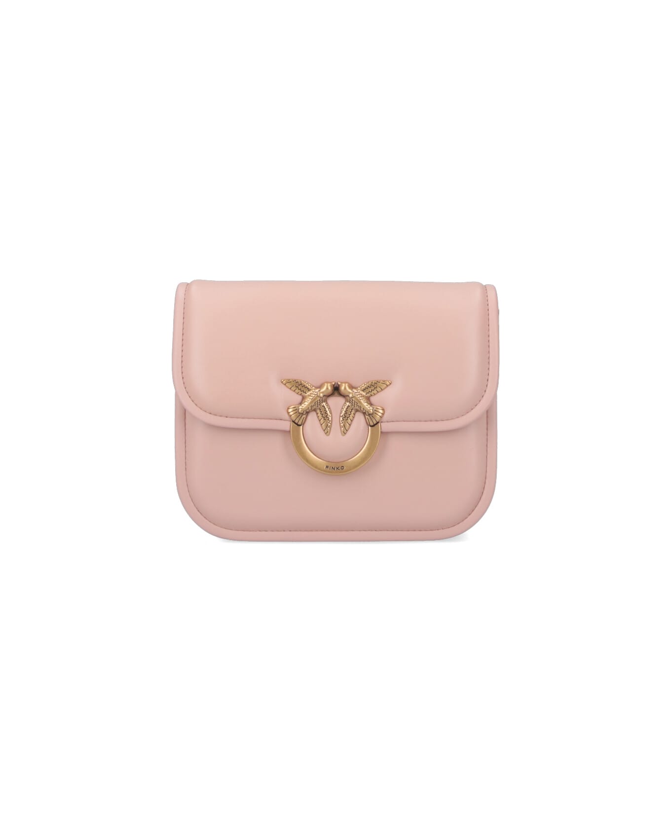 Pinko mini Love Box Bag bag in pink nappa leather with adjustable and removable shoulder strap, magnetic flap closure, gold metal "Love Birds Diamond Cut" logo detail, back logo stitching, inner zip pocket, main inner compartment.